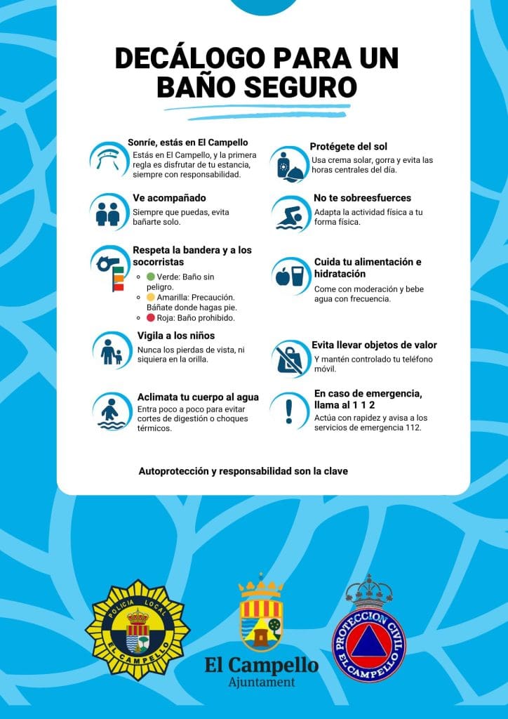 Por ello, se ha dado forma a un “decálogo” de recomendaciones, que se dará a conocer a diario en las redes sociales municipales, y figurará en lugar destacado en las instalaciones públicas de arenales y calas. El contenido del decálogo se ha consensuado con Policía Local, Guardia Civil, Protección Civil y organismos sanitarios.