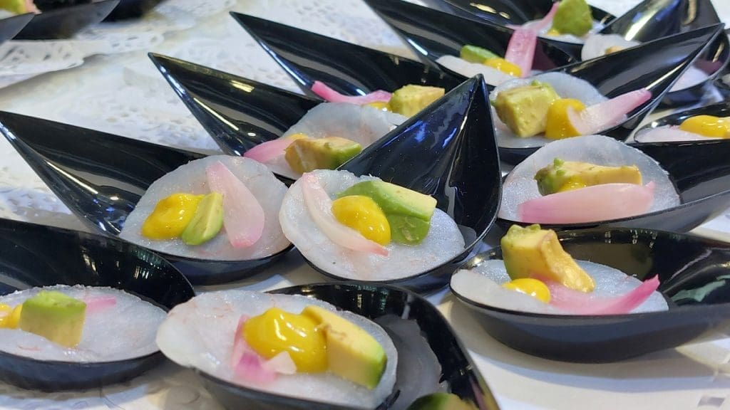 Mientras tanto, el público congregado en este espacio cedido por L’Exquisit Mediterrani de la Generalitat en FITUR ya está paladeando el carpaccio de quisquilla de Santa Pola que el cocinero ha aderezado con «un poquito de aguacate, cebolla en vinagre» y salsa con vinagre de arroz y azucar. Y para más deleite, la sugerencia del chef es acompañar este entrante con un moscatel de Xaló.