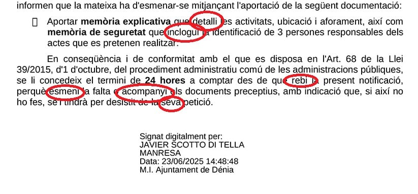 Lejos de adaptar sus comunicaciones al valenciano normativo, el Ayuntamiento remitió la notificación utilizando formas propias del catalán oriental. Ejemplos de estas formas son «detalli», «inclogui», «rebi», «esmeni», «acompanyi» o «seva». Esto ha sido interpretado por las entidades como una falta de respeto por parte del Ayuntamiento de Dénia.