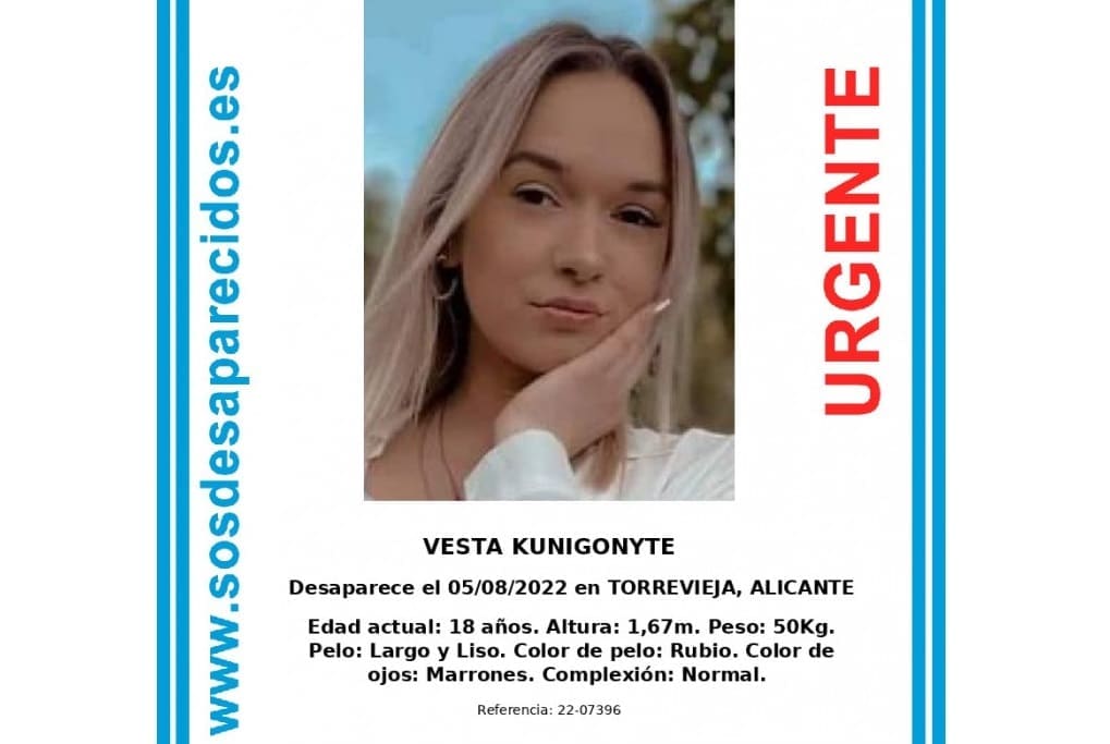 Vesta Natalija Kunigonytė, de 18 años, fue vista por última vez en Punta Prima (Torrevieja) el pasado 5 de agosto. La joven, de nacionalidad lituana estaba pasando dos semanas en Alicante en compañía de Tomas Paulauskas, lituano de 22 años, que también ha desaparecido. El día 7 de agosto deberían haberse presentado a un punto de encuentro para coger un autobús de regreso a su domicilio.