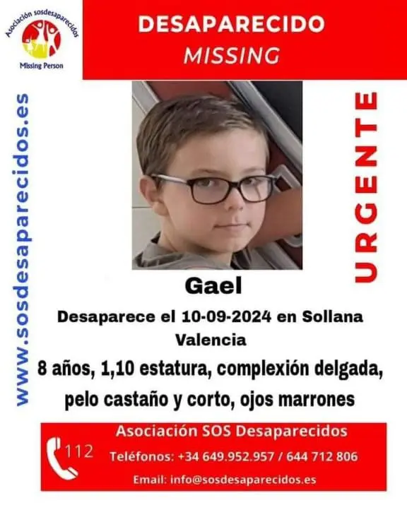 La asociación SOS Desaparecidos ha emitido una alerta de búsqueda por la desaparición de Gael en Sollana, Valencia. Se trata de un niño de ocho años que lleva en paradero desconocido desde el martes 10 de septiembre.