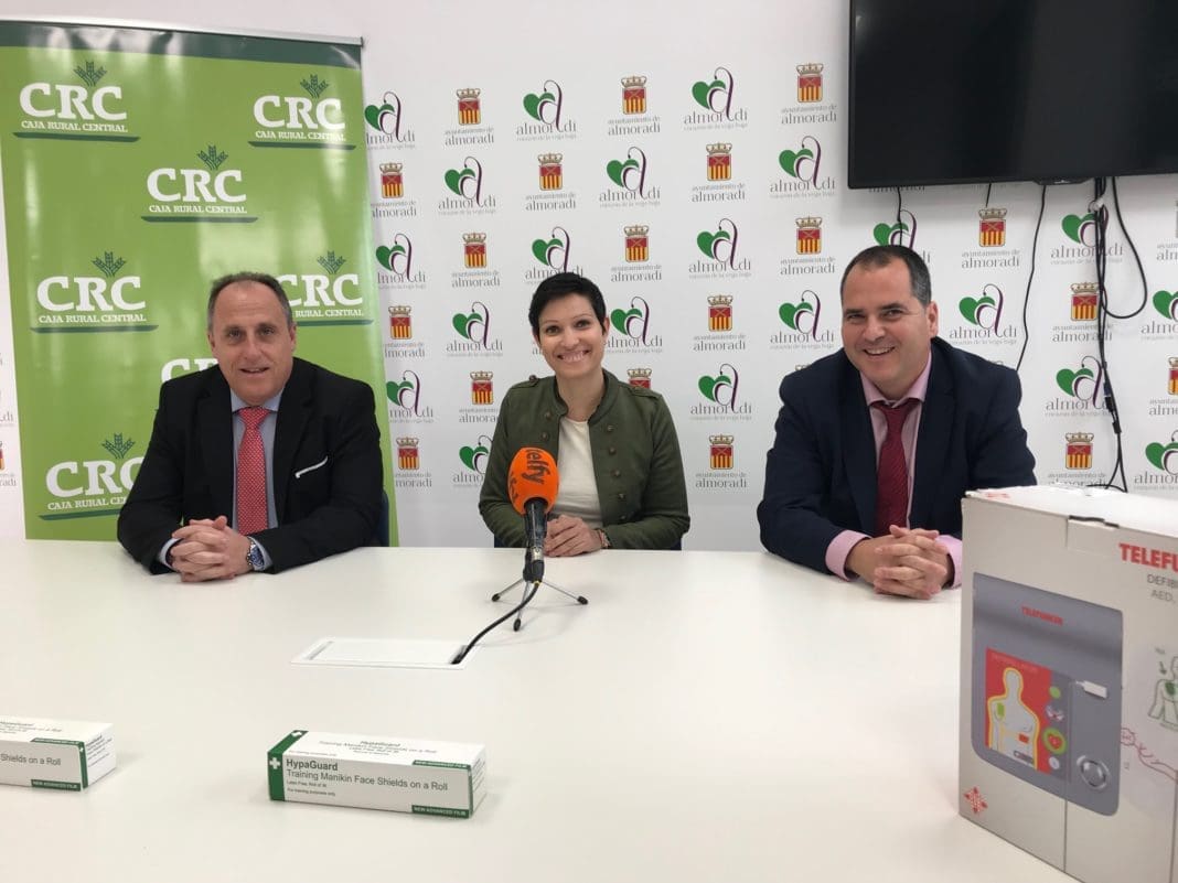La concejal de Sanidad, Almudena Albentosa, acompañada por Javier Fabregat, director de zona de Caja Rural Central y Fernando Fernández, director de Caja Rural Central de Almoradí, ha presentado la donación realizada por esta entidad que consta de dos desfibriladores portátiles.