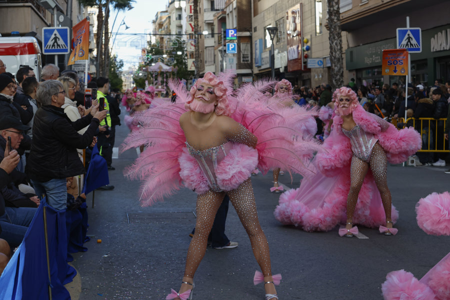 El desfile ha arrancado a las 16:00 horas desde el Centro Cultural Virgen del Carmen, en un ambiente festivo acompañado de música y animación a lo largo de todo el recorrido. Fuera de concurso han abierto la comitiva las comparsas La Sal de Torrevieja, una de las más reconocidas a nivel nacional e internacional, y Bambini, integrada por los más pequeños, con disfraces inspirados en personajes del imaginario popular.