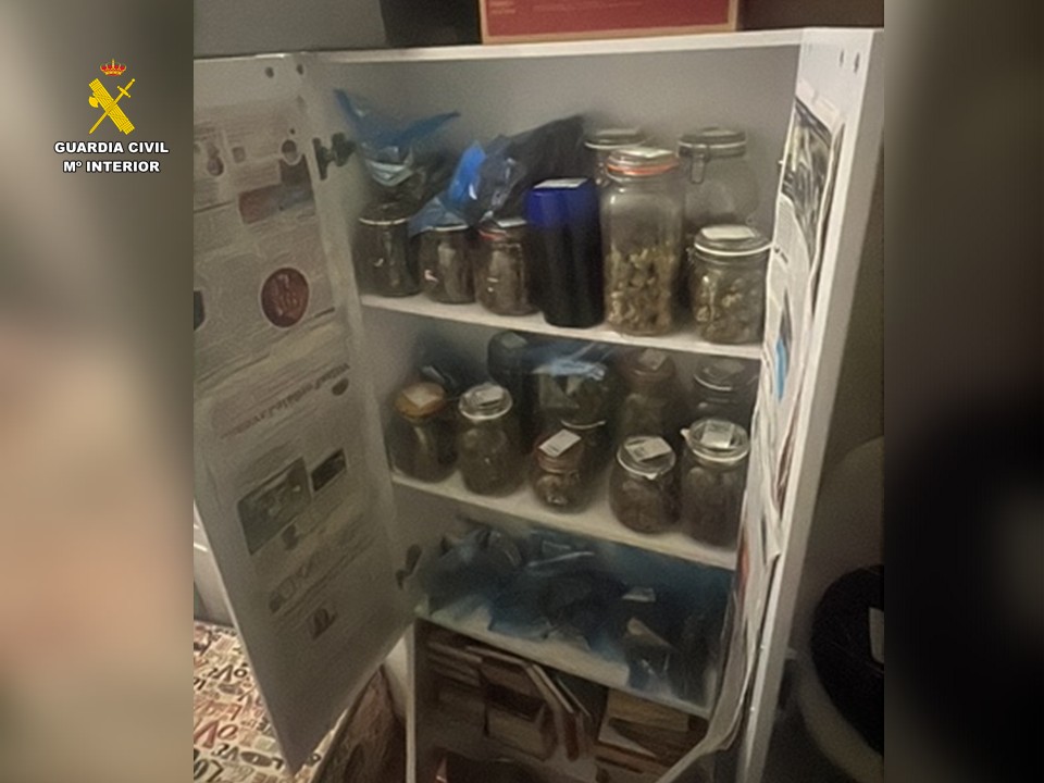 En la planta inferior, el propio investigado condujo a los agentes hasta un armario cerrado en el que almacenaba 28 tarros herméticos con cogollos secos de marihuana, 30 bolsas de plástico con cogollos listos para su distribución, gran cantidad de bolsas individuales etiquetadas con distintas variedades de cannabis, así como una vinoteca destinada a la conservación de semillas y diversos útiles de pesaje y manipulación.