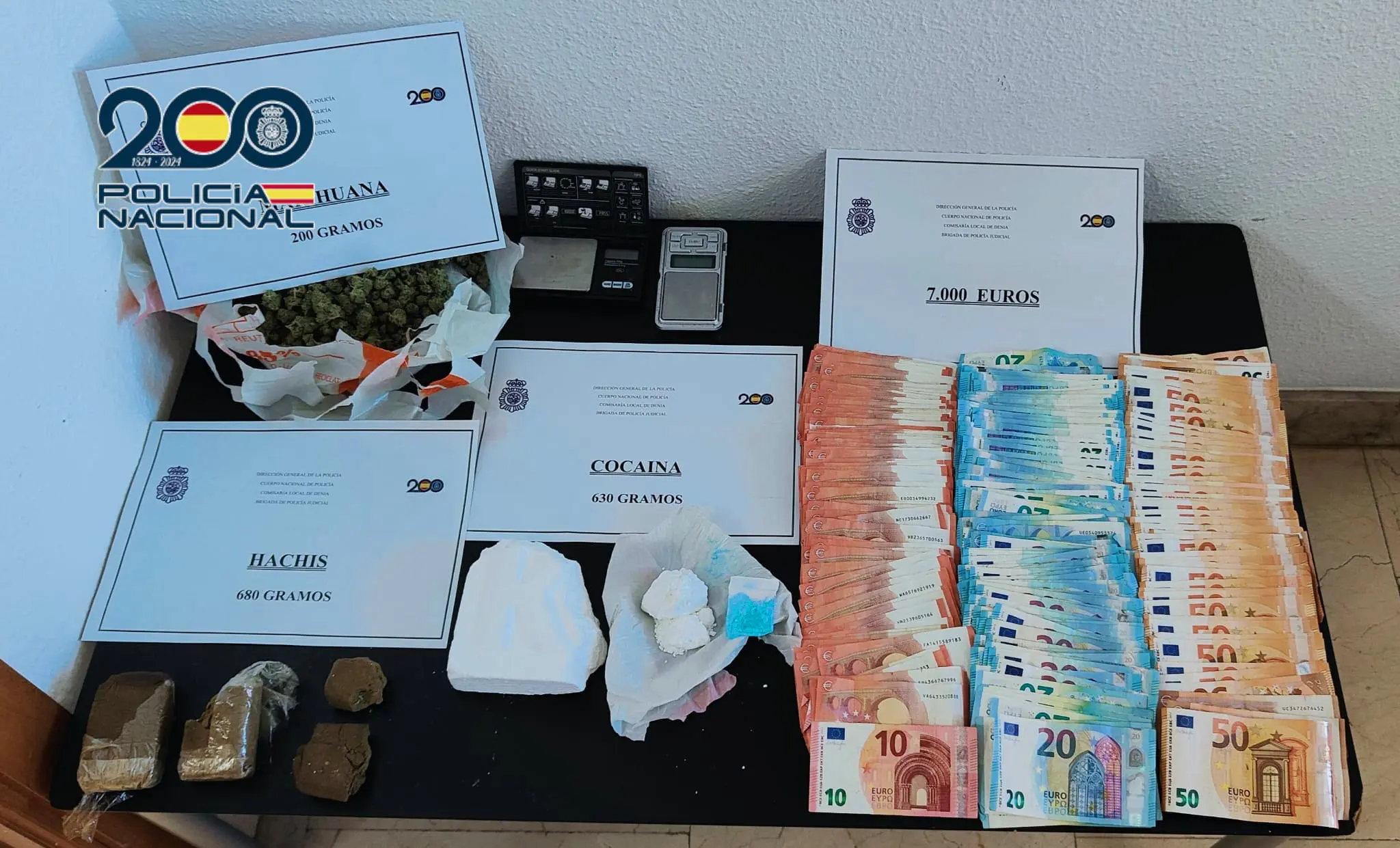 El eficaz resultado del registro fue, en buena parte, gracias a la colaboración del Grupo de Guías Caninos de la Comisaría Provincial de Alicante, cuya estrecha colaboración con el grupo de Policía Judicial encargado del caso durante la fase de explotación, se consiguió intervenir; 200 gramos de marihuana, 680 gramos de hachís, 630 gramos de cocaína y 7.580 euros en efectivo.