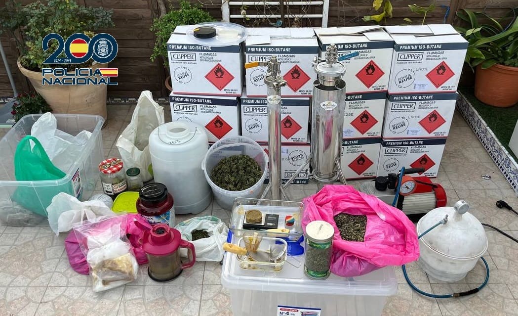 La Policía Nacional quiere destacar la existencia de un laboratorio para la transformación de los cogollos de marihuana en “Rosin”, y que contaba con todo el instrumental necesario para realizar la extracción del cánnabis a través de diferentes procedimientos de variación de temperatura, presión y tiempo, consiguiendo productos sólidos y líquidos que podrían llegar a vapearse.