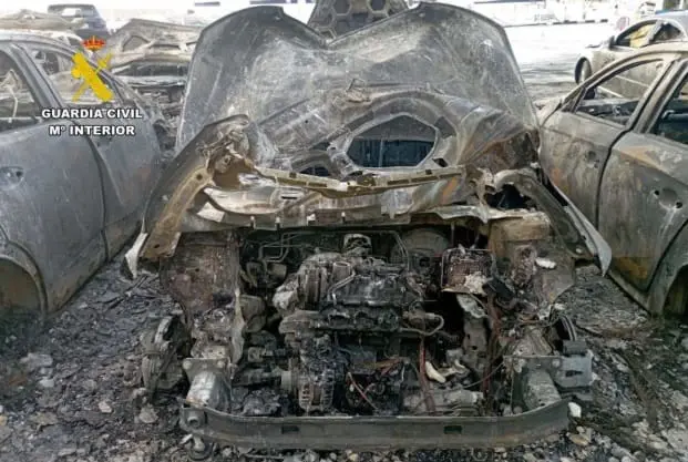 La Guardia Civil ha detenido a los presuntos autores del incendio ocurrido en un aparcamiento de vehículos de la localidad de Jávea, en el que ardieron 34 vehículos, muchos de los cuales quedaron completamente calcinados.