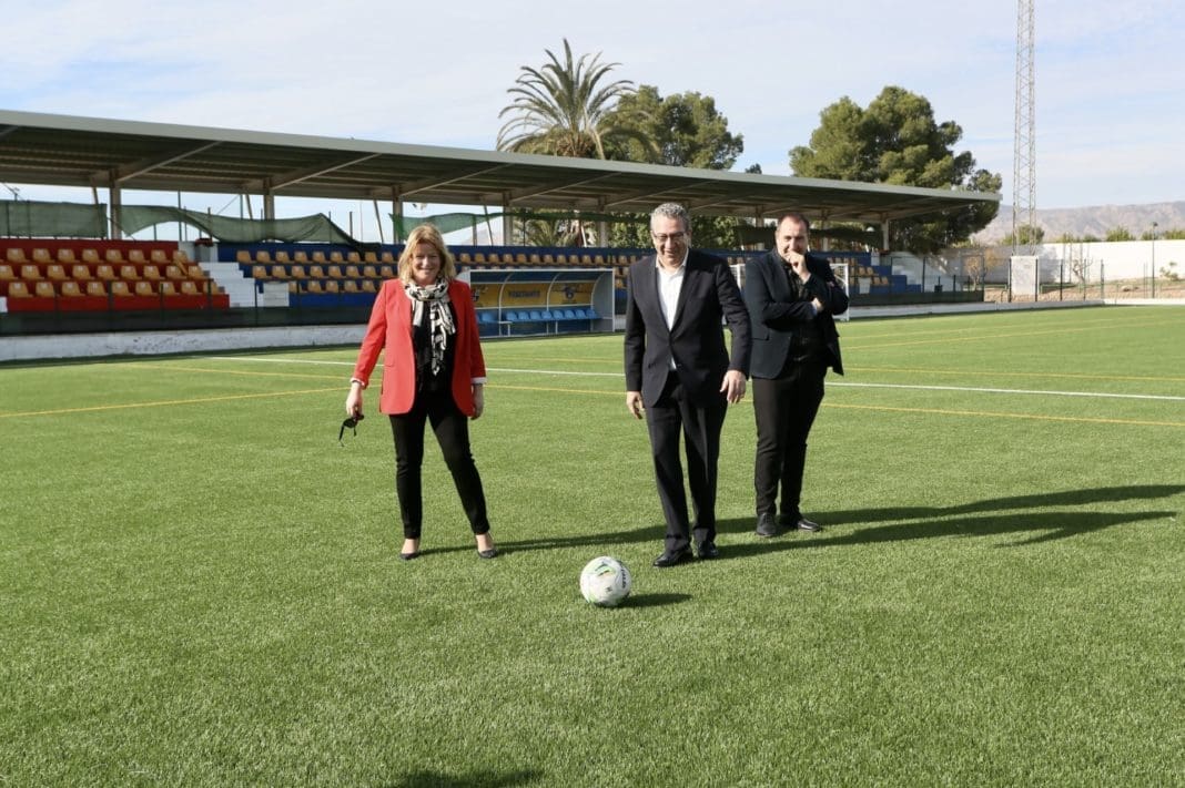 El presidente de la Diputación de Alicante, Toni Pérez, se ha desplazado esta mañana hasta Albatera para visitar las obras de renovación del césped artificial del campo de fútbol ‘El Calvario’ de la localidad, una actuación que ha sido sufragada al 100% por la institución provincial con 174.000 euros.