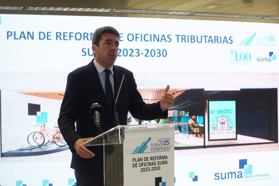 El presidente de la Diputación de Alicante, Carlos Mazón, ha anunciado hoy en Elche que Suma reformará su oficina tributaria de Carrús con el objetivo de mejorar su funcionalidad y sostenibilidad medioambiental, realizando un refuerzo de las tecnologías digitales que hagan más ágil y eficiente el servicio que presta a ciudadanos y ayuntamientos.