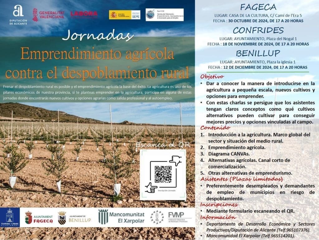 La Diputación de Alicante ofrecerá durante los próximos meses tres jornadas sobre emprendimiento agrícola contra el despoblamiento rural para favorecer el autoempleo y nuevas salidas laborales. Estas charlas formativas, que se desarrollarán en los municipios de Fageca, el 30 de octubre; Confrides, el 18 de noviembre; y Benillup, el 12 de diciembre, están subvencionadas por el Servicio Valenciano de Empleo y Formación LABORA.