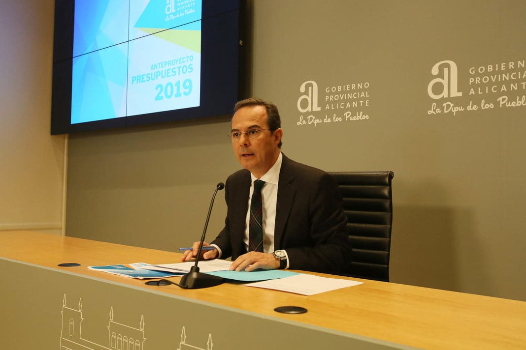 La asistencia y apoyo a los municipios, la inversión en materia de agua y la atención a las personas serán los principales ejes del presupuesto de la Diputación de Alicante para 2019, que se elevarán a 214 millones de euros en el capítulo de Gastos, lo que supone un 9,2% más que el pasado año, y a 224,4 millones en Ingresos, tal y como ha detallado esta mañana el portavoz del Gobierno Provincial, Carlos Castillo.