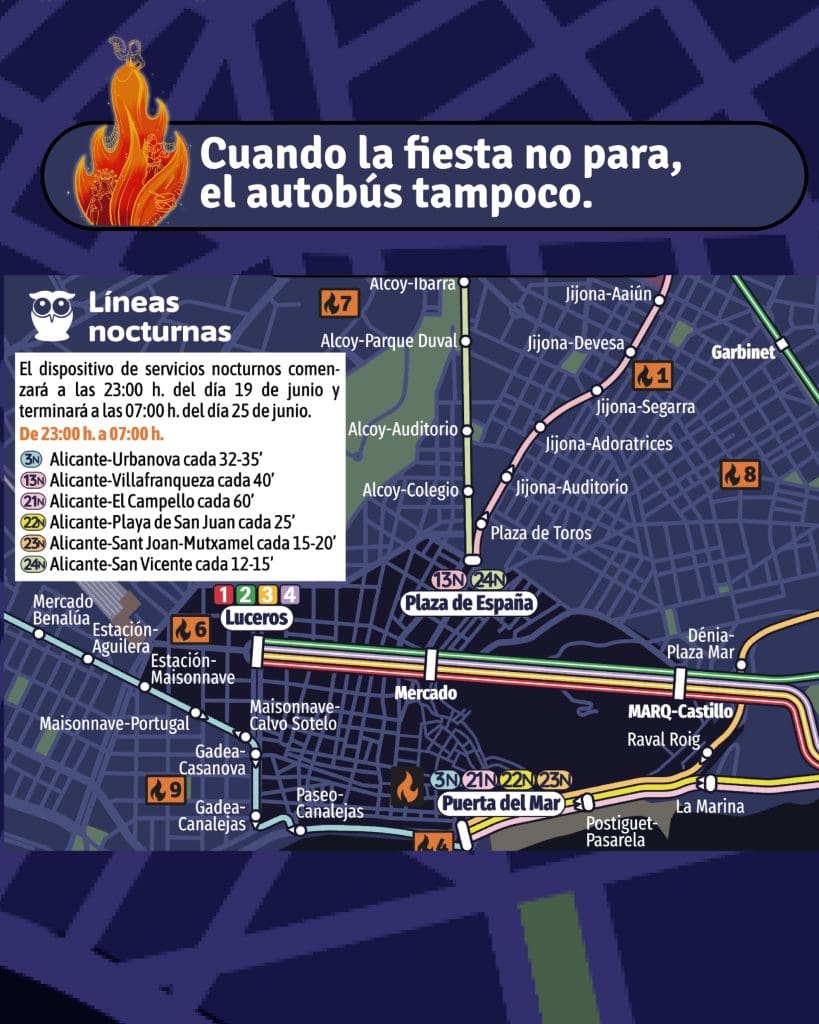El jueves 19 se activan desde las 23 horas y hasta el día 25 a las siete de la mañana las líneas del autobús urbano nocturno 3N, 13N, 21N, 22N, 23N y 24N. El resto de líneas que también se vean afectadas por la presencia de monumentos fogueriles, barracas, racós o calles adornadas, también tendrán sus oportunos desvíos, de los que se informará puntualmente por el operador del servicio a través de su web https://alicante.vectalia.es/alertas/.