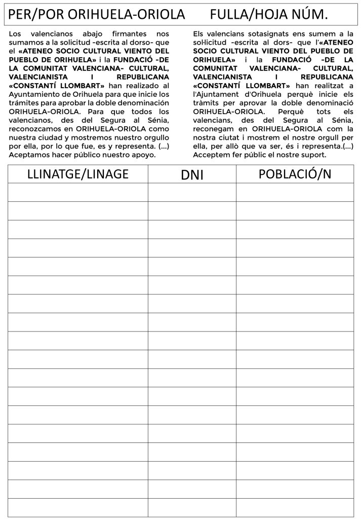 El Ateneo Viento del Pueblo de Orihuela y la Fundació Constantí Llombart registraron el pasado 27 de mayo de 2025 una petición dirigida al alcalde José Vegara Durá. Solicitaron que el Ayuntamiento promoviera y alcanzara la unanimidad —o al menos un voto mayoritario de las fuerzas favorables a la autonomía valenciana— para aprobar la doble denominación Orihuela-Oriola.