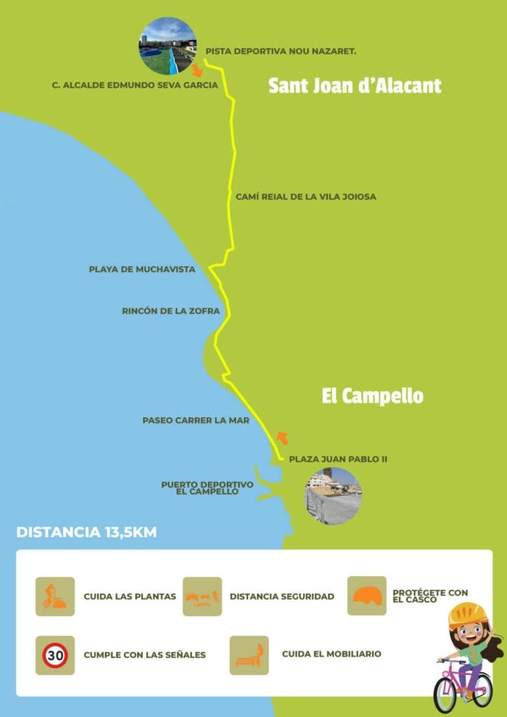 La prueba no es competitiva, aunque habrá sorteo de premios. El recorrido es de 13,7 kilómetros, y arrancará a las 10:00 horas de la Plaza Juan Pablo II de El Campello, llegará hasta la pista deportiva Nazaret de Sant Joan, y vuelta a El Campello.