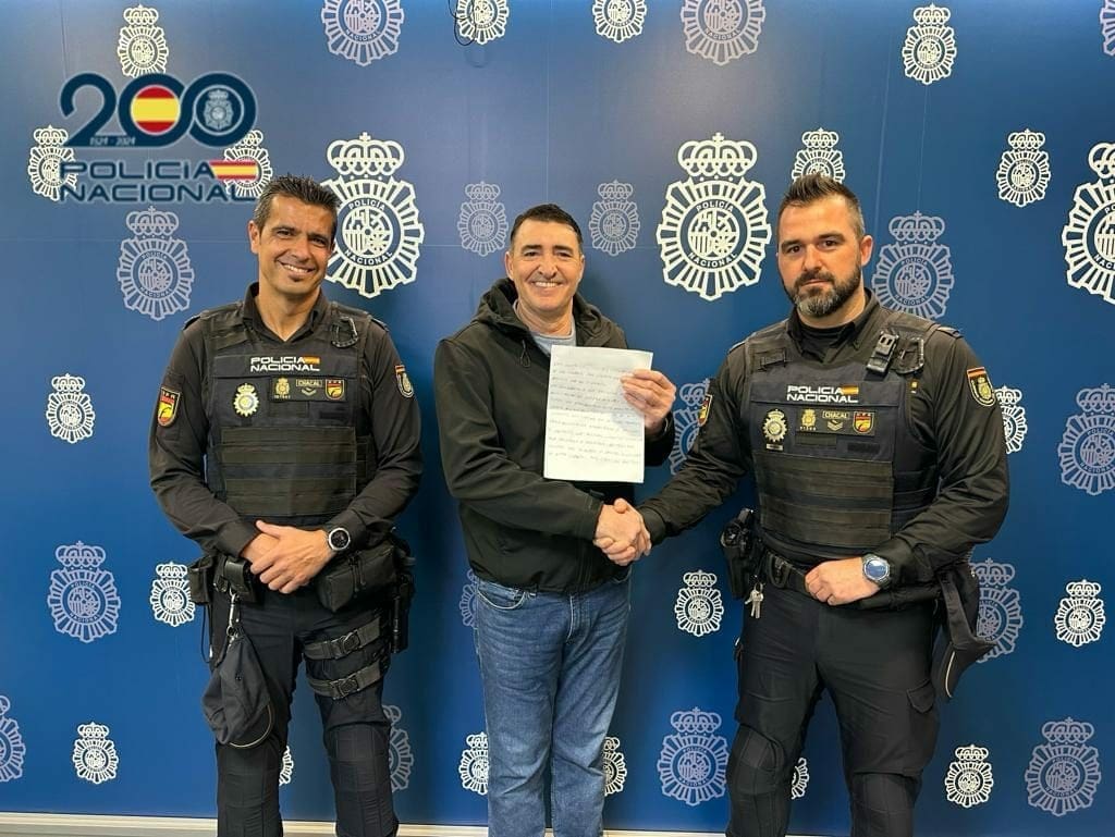 Jose Vicente de 57 años de edad, no ha querido dejar pasar la ocasión y ha acudido en un día tan importante para la Policía Nacional como es hoy y entregar una carta de agradecimiento a los dos agentes que el pasado jueves le salvaron la vida, haciéndose una foto con ellos.