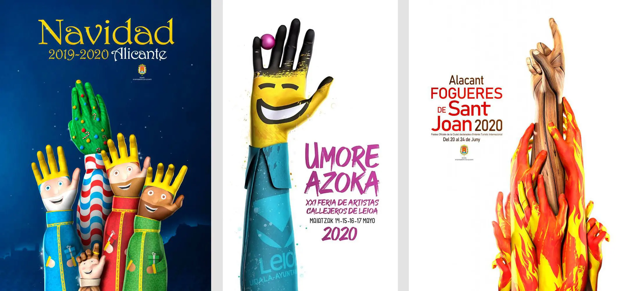 Siguiendo en la misma línea, desgranamos los diseños titulados «Ya están aquí» (Navidad y Reyes) y «Concepto» (Fogueres de Sant Joan). Ambas obras tienen la similitud de que «las manos están arriba» un elemento muy recurrente en las representaciones del diseñador murciano. Las diferencias entre los diseños la comprobamos en las siguientes características. En el cartel de Navidad, la representación de la mano se centra en los rostros de los Tres Reyes Magos mientras que en el de Hogueras el aspecto clave son las manos bañadas de fuego.