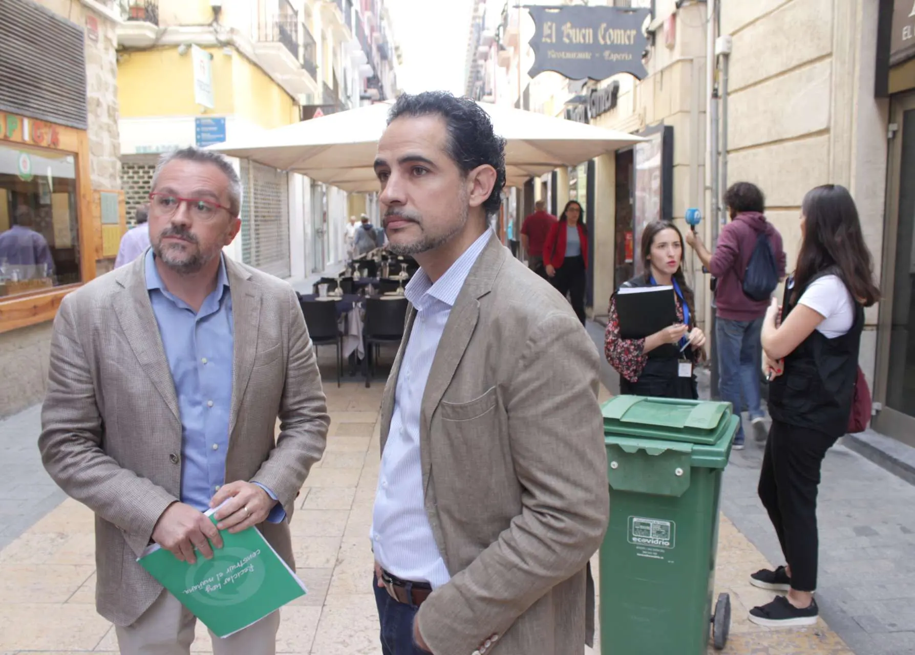 El concejal de Medio Ambiente, Israel Cortés, y el delegado de zona d Ecovidrio, Roberto Fuentes, han presentado esta mañana la campaña de refuerzo del «Servicio de Recogidad de Vidrio Puerta a puerta» en los establecimientos hosteleros del centro tradicional de Alicante, incluido el entorno del Mercado y el Casco Antiguo. En tres días se ha pasado de 120 a más de 200 locales adheridos y el objetivo es alcanza un centenar más que representará en la práctica la casi totalidad.