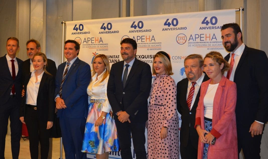 El alcalde de Alicante, Luis Barcala, la vicealcaldesa, Mari Carmen Sánchez, y los concejales de Comercio – Hostelería, junto al de Fiestas, han tomado parte en la gala de la Asociación de Empresarios de Hostelería de la Provincia de Alicante (APEHA), que ha festejado su 40 aniversario.