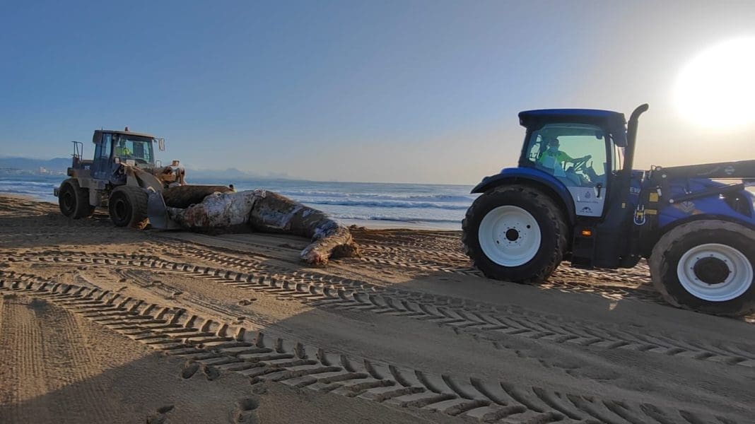 Operarios del servicio municipal de limpieza, UTE Elche, han procedido esta misma mañana a la retirada del cuerpo de una ballena de cerca de ocho toneladas que ha aparecido en la playa de El Altet.