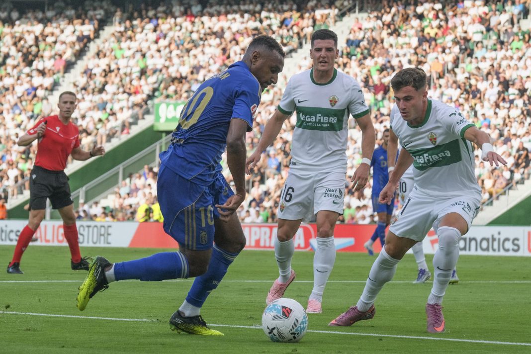 El Oviedo alcanzó el descanso contra las cuerdas ante un Elche dinámico y vertical que encontró casi siempre la forma de romper la presión de su rival en la medular.