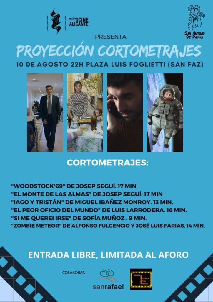 La sesión empezará con dos cortos del departamento de audiovisuales del centro San Rafael ‘Woodstock,69’ y ‘El monte de las almas’, dirigido por Josep Seguí. Le seguirá el corto ganador de la última edición del Festival, ‘Iago y Tristán’ del realizador alicantino Miguel Ibáñez Monroy; ‘El peor oficio del mundo’, cortometraje ganador del premio al mejor actor para Luis Larrodera; ‘Si me queréis irse’ de Sofía Muñoz cortometraje ganador del premio a la mejor actriz, y ‘Zombie Meteor’, de Alfonso Fulgencio y José Luis Farías, ganador del mejor cortometraje de animación