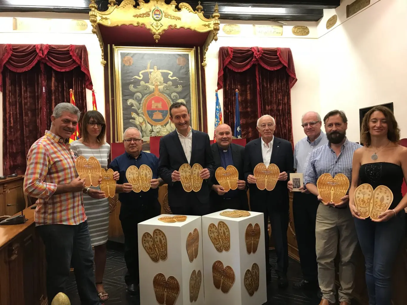 La suela de los zapatos de la Virgen de la Asunción y las alas del ángel son los dos símbolos que protagonizan el nuevo abanico del Misteri d’Elx, que se presentó ayer en el Salón de Plenos del Ayuntamiento de Elche. Los creadores de la obra han sido los ilicitanos Luís Maestre y Javier Poveda, quienes han querido mostrar dos de los iconos característicos de la Vespra y la Festa.
