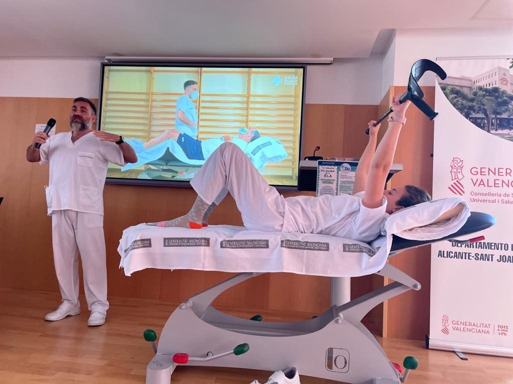 “Es muy importante hacer ejercicios respiratorios y estiramientos sobre todo en la primera fase de la enfermedad, eso les ayuda a retrasar algunos síntomas tonificando su musculatura y a tener una mejor calidad de vida”, comenta Juan Espinar, fisioterapeuta del centro. El vídeo “Fisioterapia para pacientes con ELA” está en Youtube y puede descargarse a través de un código QR que se puede ver en la web del departamento de Alicante-Sant Joan d’Alacant.