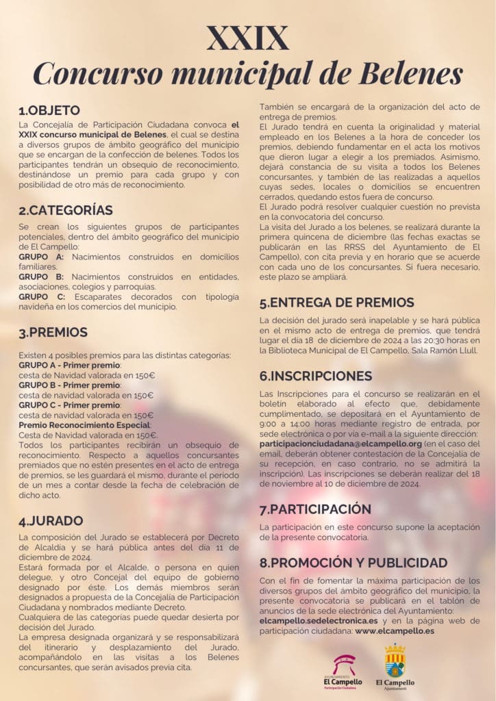 Nacimientos en domicilios particulares, nacimientos en entidades, asociaciones, colegios o parroquias, y decoración navideña en escaparates comerciales. Son las tres categorías que el Ayuntamiento de El Campello ha establecido para la XXIX edición del concurso de belenes de este año. Para participar, se requiere inscripción previa, rellenando una ficha, en el correo electrónico participacionciudadana@elcampello.org.