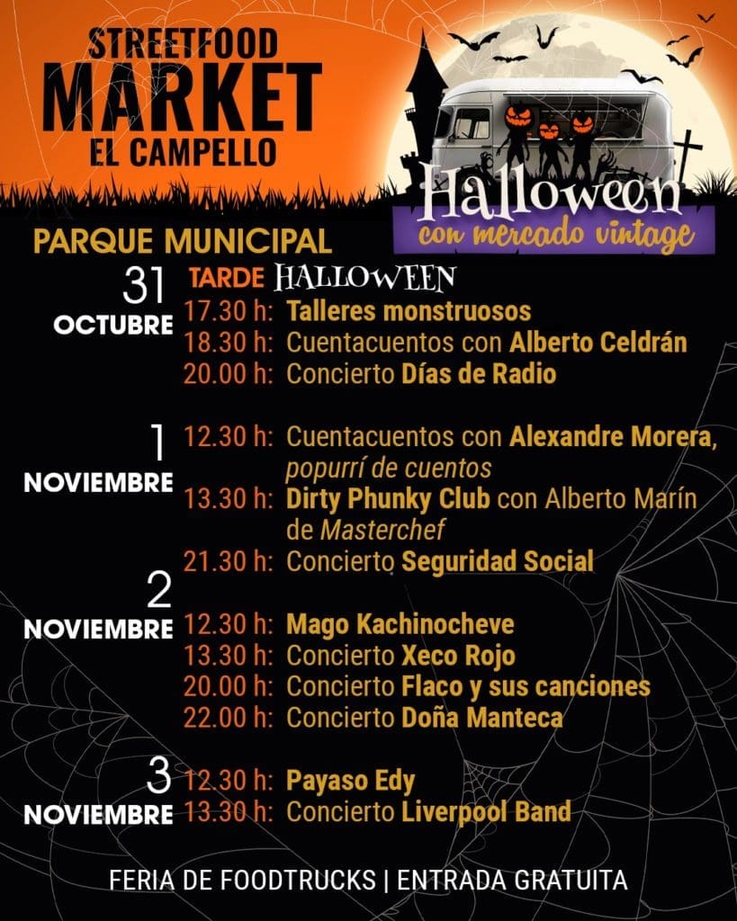 Este año, la programación abarca desde la tarde del jueves 31 de octubre (el viernes es festivo nacional), hasta el mediodía del domingo 3 de noviembre. En diferentes horarios, habrá conciertos en directo, mercado vintage, feria gastronómica con los populares “foodtrucks”, talleres y animación para los peques con cuentacuentos, payasos y magos.