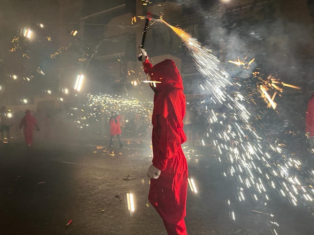 Y a las 24:00 horas en punto, la Colla de Dimonis volverá a llenar de música, pólvora, fuego y color el circuito que discurre desde la Avenida de la Generalitat hasta el castillo festero instalado en la Plaza Saint Christol Les Allez. Será el momento del “correfocs”, que resulta siempre multitudinario, con mascletá final y participación activa de la Colla de dolçainers i tabaleters Larraix.