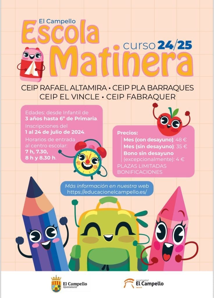 La Escola matinera es un Servicio municipal de apoyo a la conciliación familiar, destinado a alumnado escolarizado desde Educación Infantil de 3 años hasta sexto Primaria.