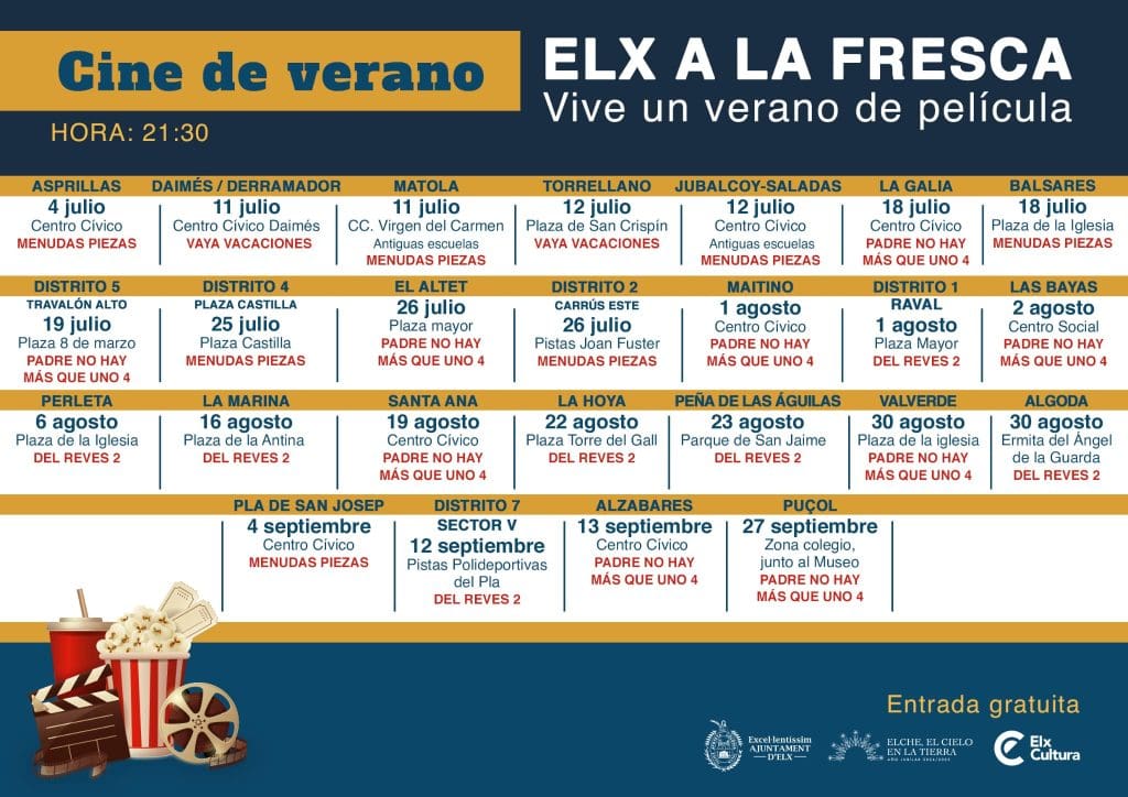 Todas las proyecciones tendrán lugar a partir de las 21.30 horas en las distintas plazas y lugares habilitados en barrios y pedanías. La programación completa se puede consultar a través de la página web del Ayuntamiento de Elche o de las redes sociales.
