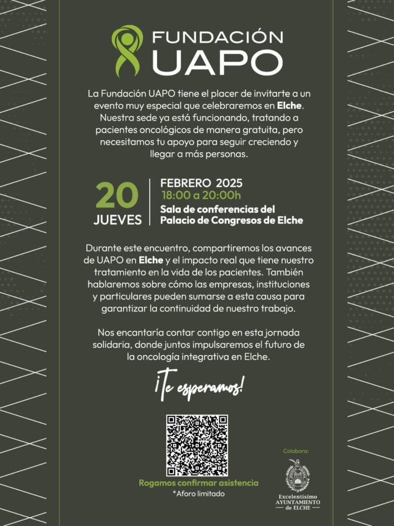 El Centro de Congresos acoge el próximo jueves 20 de febrero el evento organizado por la Fundación UAPO (Unidad de Apoyo al Paciente Oncológico) en colaboración con el Ayuntamiento de Elche para impulsar la oncología integrativa en la provincia de Alicante.