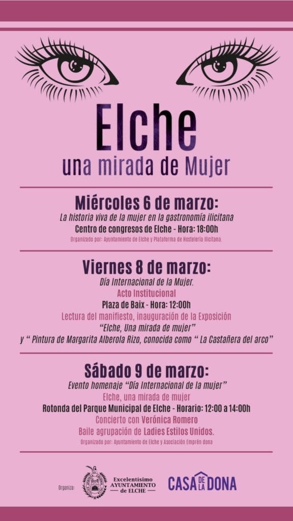 El primer evento, organizado en colaboración con la Plataforma de Hostelería Ilicitana, consiste en una jornada llamada La historia viva de la mujer en la gastronomía ilicitana que tendrá lugar el miércoles 6 en el Centro de Congresos a las 18:00 horas. La presidenta de la Plataforma de Hostelería Ilicitana, Paqui Solves, ha comentado que se realizarán diferentes ponencias de mujeres del mundo de la hostelería, gastronomía y ámbitos relacionados.