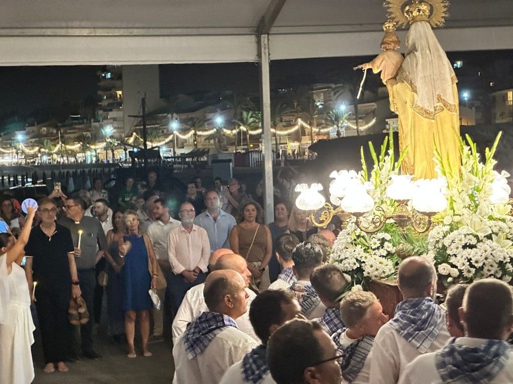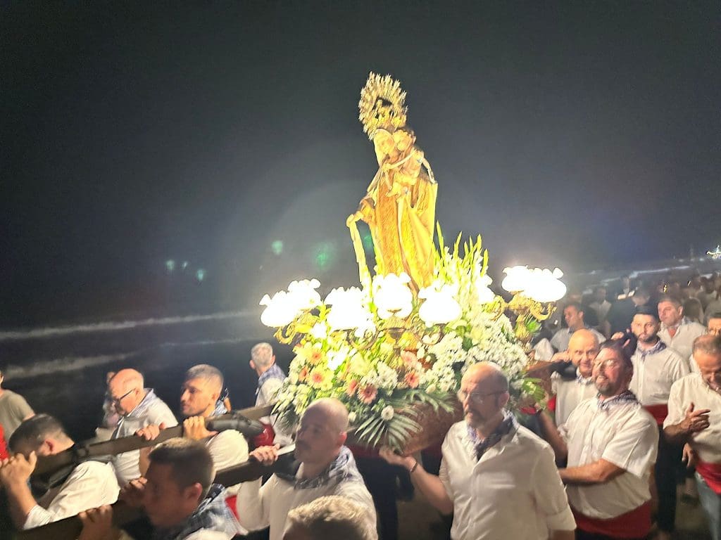 La peculiaridad de este acto radica en que el traslado se realiza atravesando la playa, sobre la arena, lo que ofrece una imagen atractiva por el paso de un trono iluminado y decenas de luminarias que portaban los participantes, entre los que se encontraban el alcalde, Juanjo Berenguer; la concejala de Fiestas y Tradiciones, Marisa Navarro, y ediles de los partidos PP, PSPV-PSOE y Vox.