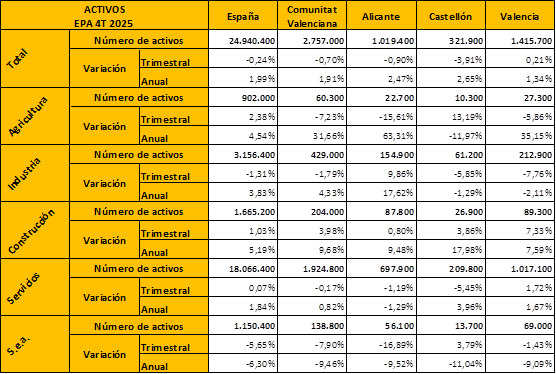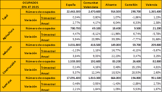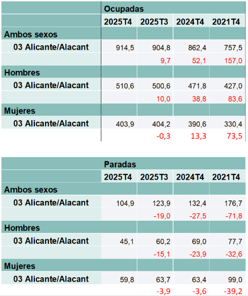 Durante el cuarto trimestre, la ocupación ha aumentado en 9.700 personas en la provincia (1,07 %), mientras que el paro ha descendido en 19.000 personas, consolidando una tendencia favorable al cierre del ejercicio. En el conjunto del año, Alicante ha sumado 52.100 personas ocupadas más, alcanzando cifras récord de empleo.