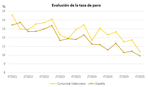 En el conjunto de la Comunitat Valenciana, la ocupación ha crecido en 19.600 personas durante el trimestre (0,80 %), mientras que el paro ha descendido en 39.100 personas (12,01 %), una caída más intensa que la media nacional. La tasa de paro autonómica se sitúa en el 10,39 %, aún por encima del promedio estatal (9,93 %).