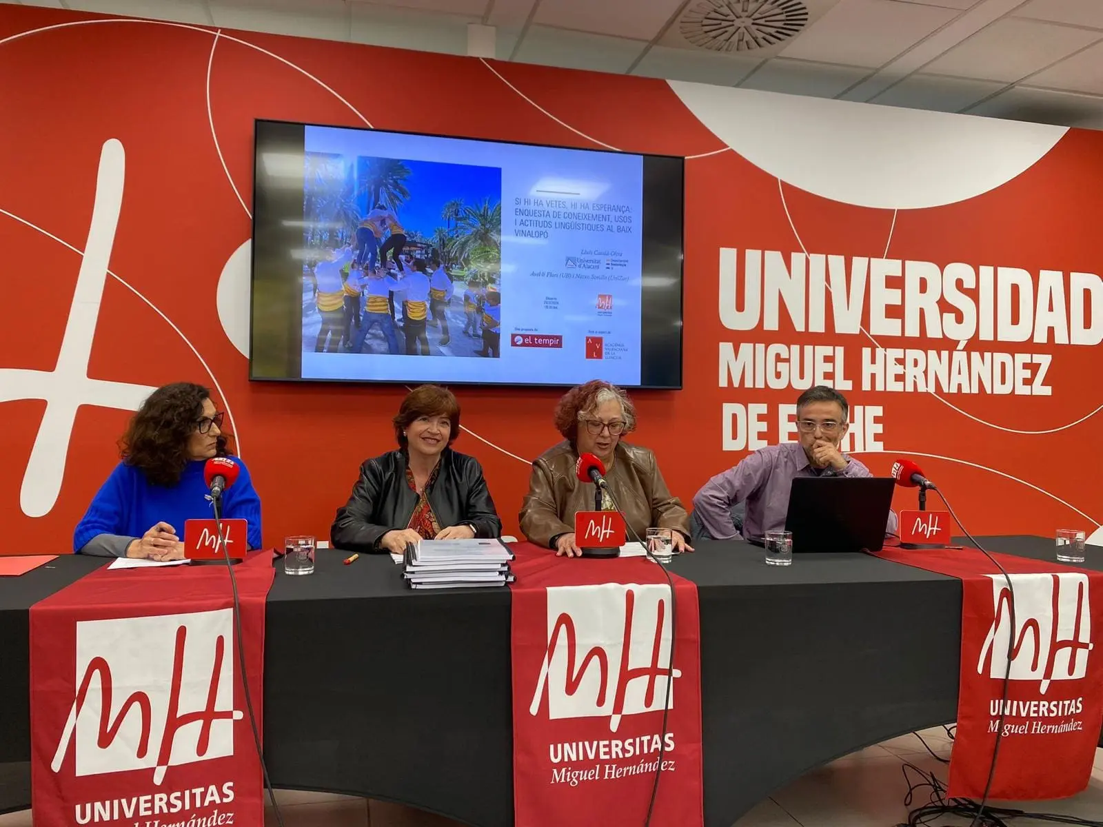 En la presentación de la encuesta han participado la presidenta de la institución, Verònica Cantó; Tudi Torró, presidenta de la Sección de Fomento de la AVL; Lluís Català, autor del estudio y profesor de la Universidad de Alicante, y Asunción Amorós, vicerrectora de Cultura, Igualdad y Diversidad de la Universidad Miguel Hernández de Elche.