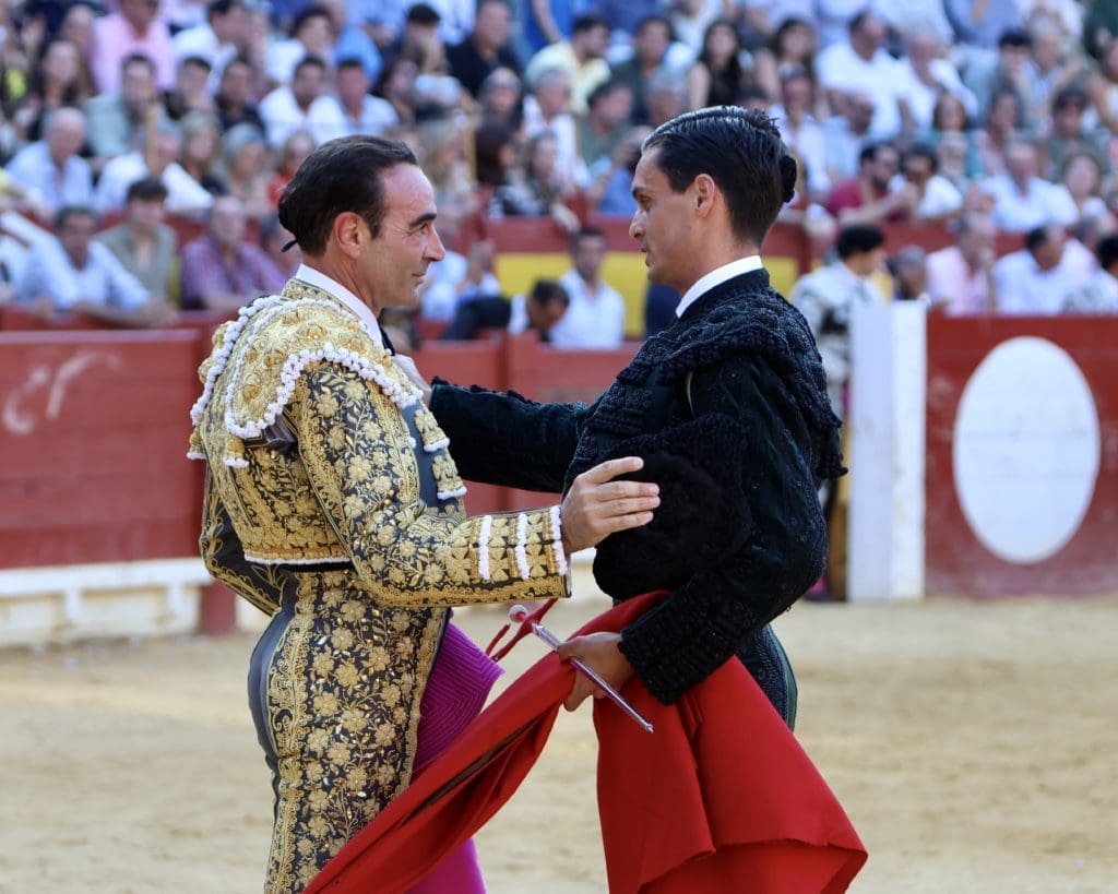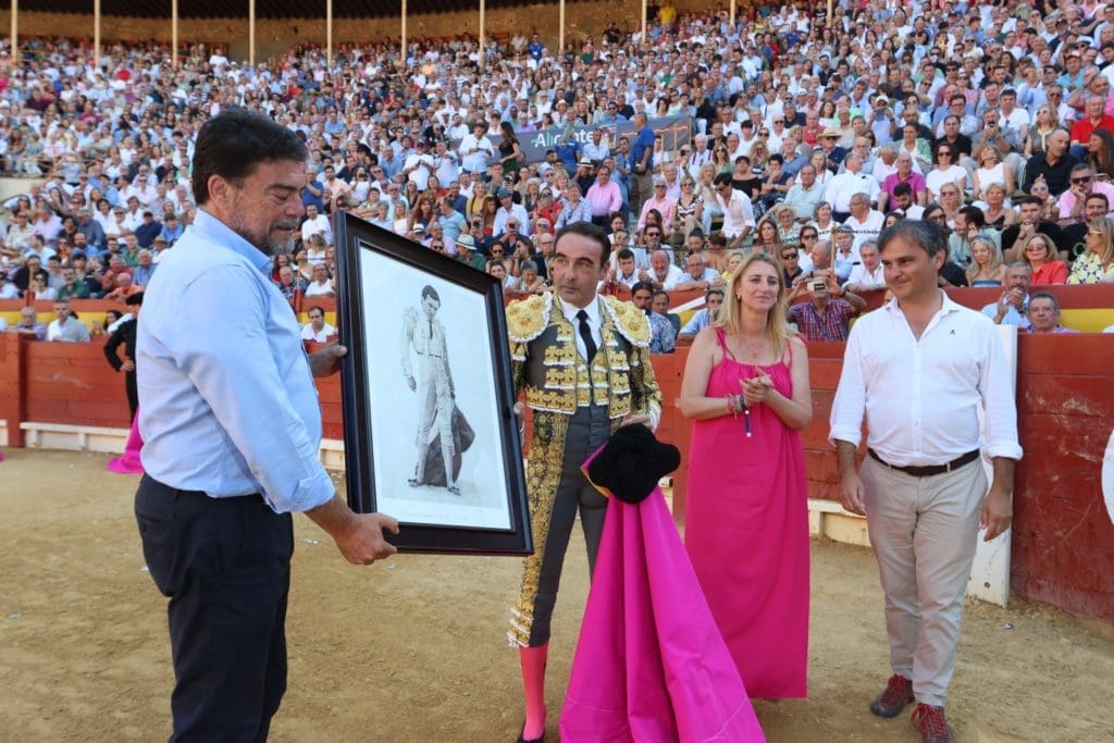 Enrique Ponce no tardó en devolver el cariño mostrado por la afición de Alicante, en la persona de su alcalde, el empresario de la plaza, Nacho Lloret, de quienes recibió una placa conmemorativa de su despedida de la plaza alicantina, y el público presente en la plaza, que le obligó a saludar antes de que saliera el primero de la tarde.