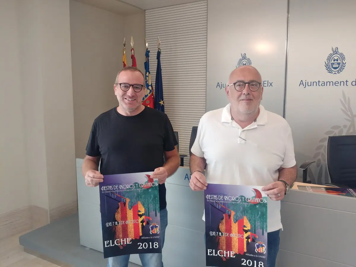 El edil de Fiestas, José Pérez, y el presidente de la Asociación Festera de Moros y Cristianos de Elche, José María Vera, han presentado esta mañana la programación de la entidad Festera para las Fiestas de Agosto, que trae algunas novedades, como la Entraeta, que este año se realizará antes del Pregón y no después, como era habitual.