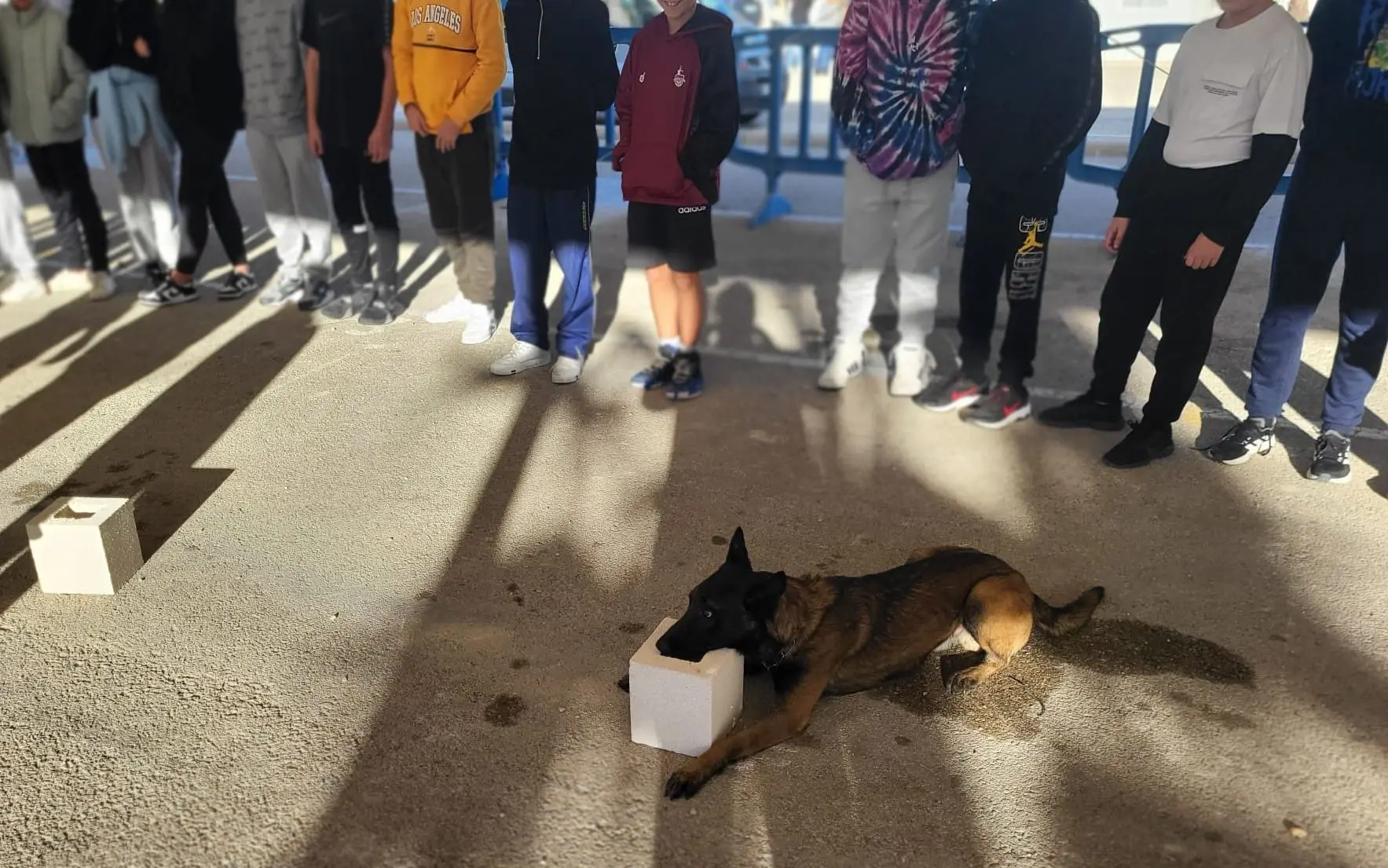 Con respecto a los agentes caninos Indio y Nero, sus guías pudieron mostrar a los alumnos y alumnas el trabajo que realizan tanto en la detección de sustancias prohibidas mediante la técnica de «marcaje lapa» como el uso de animales para control de situaciones de seguridad ciudadana. Todas las demostraciones finalizaron con la interacción de los alumnos y alumnas con los agentes caninos, quienes se dejaron querer y acariciar por los estudiantes.
