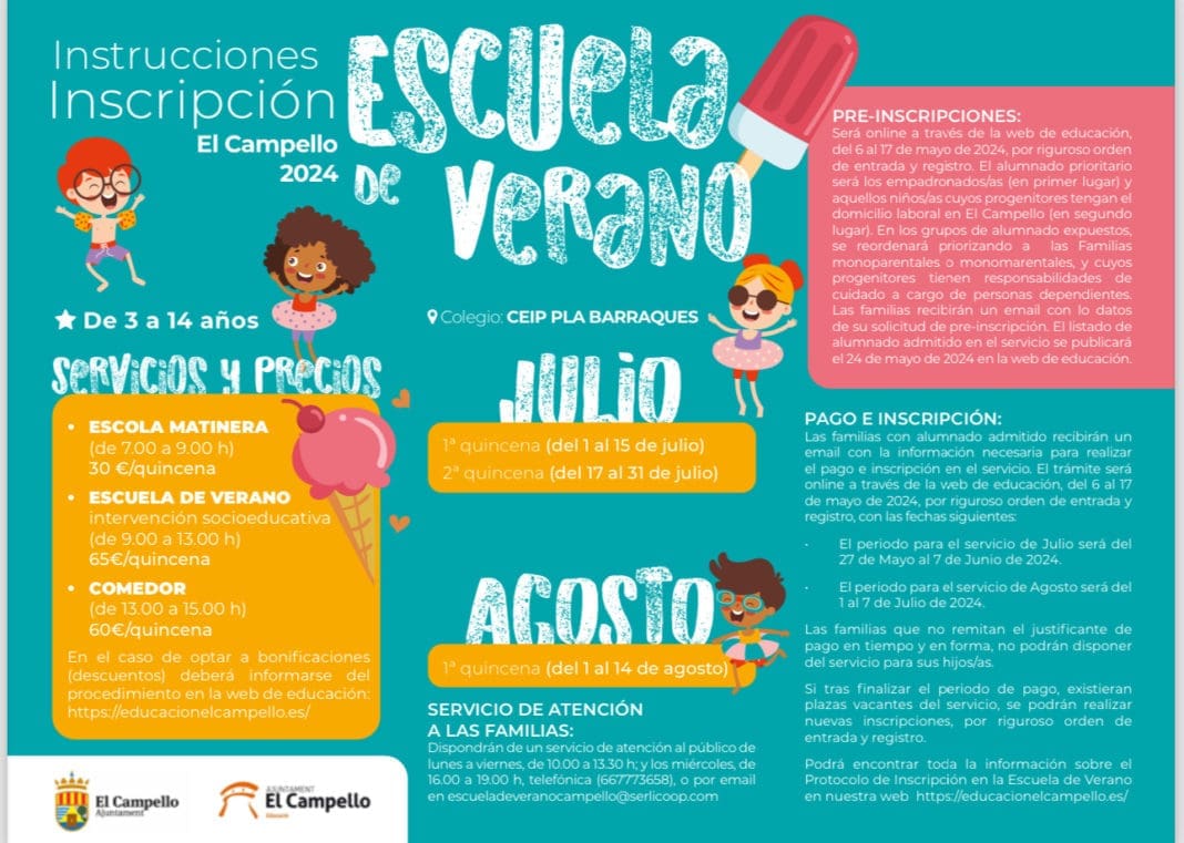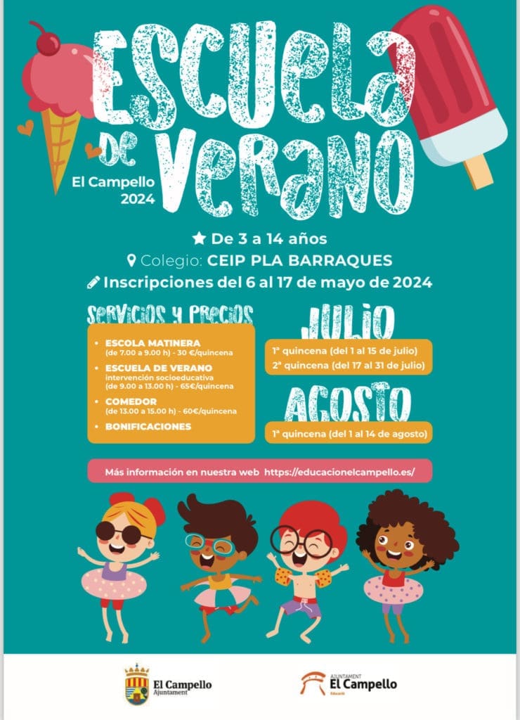 La Escuela de Verano es un recurso de la concejalía de Educación que dirige Dorian Gomis para favorecer la conciliación familiar y/o ocupacional de las familias. La propuesta pretende el apoyo a la familia del alumnado, y proporcionar un espacio educativo y seguro donde los pequeños puedan permanecer en periodo estival de vacaciones, entre los meses de julio y agosto, si por circunstancias laborales o de otra índole las familias lo necesitan.