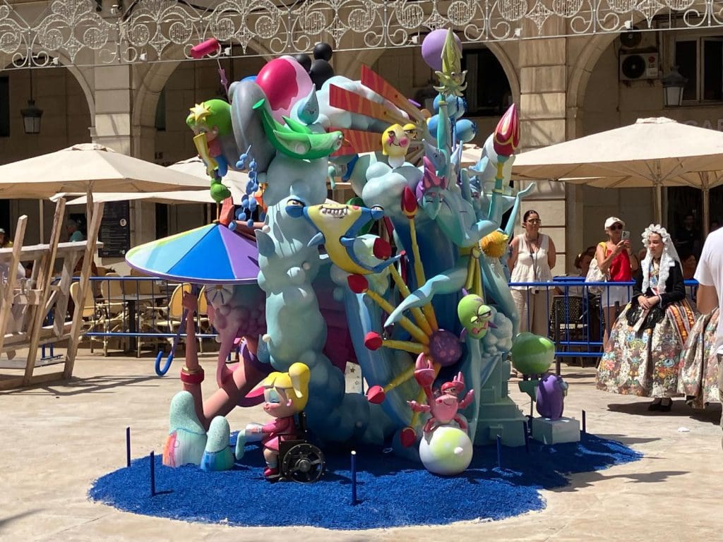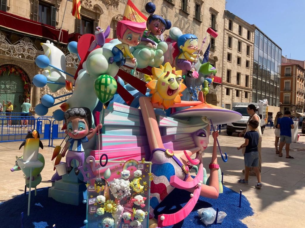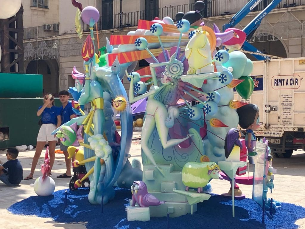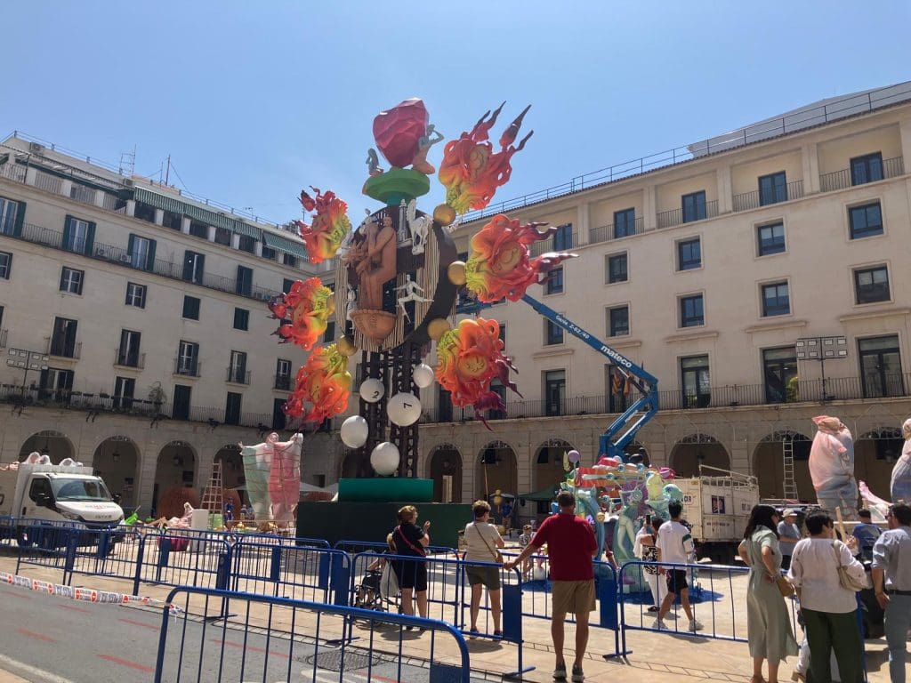 La Hoguera infantil ya estaba completamente terminada por la mañana. Se estaban esperando los carteles de la imprenta. El equipo recibió anoche los materiales para agilizar la plantà este miércoles. «A las 7 de la mañana estábamos aquí. Entonces ya ha ido muy ágil todo», ha aclarado el artista foguerer.
