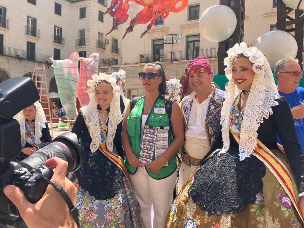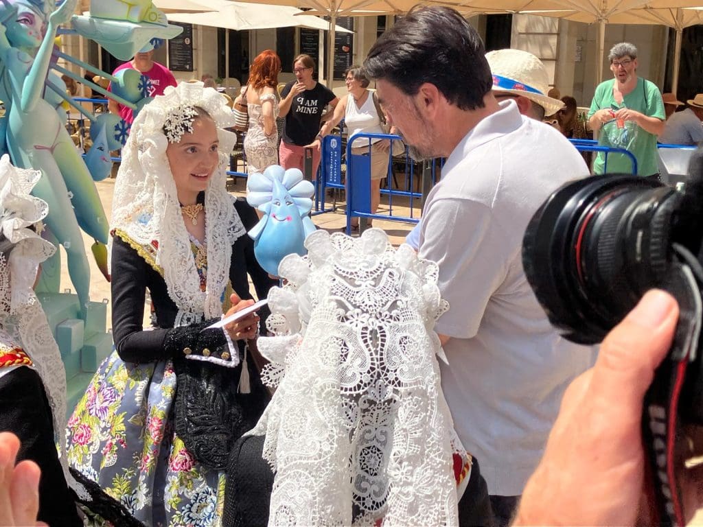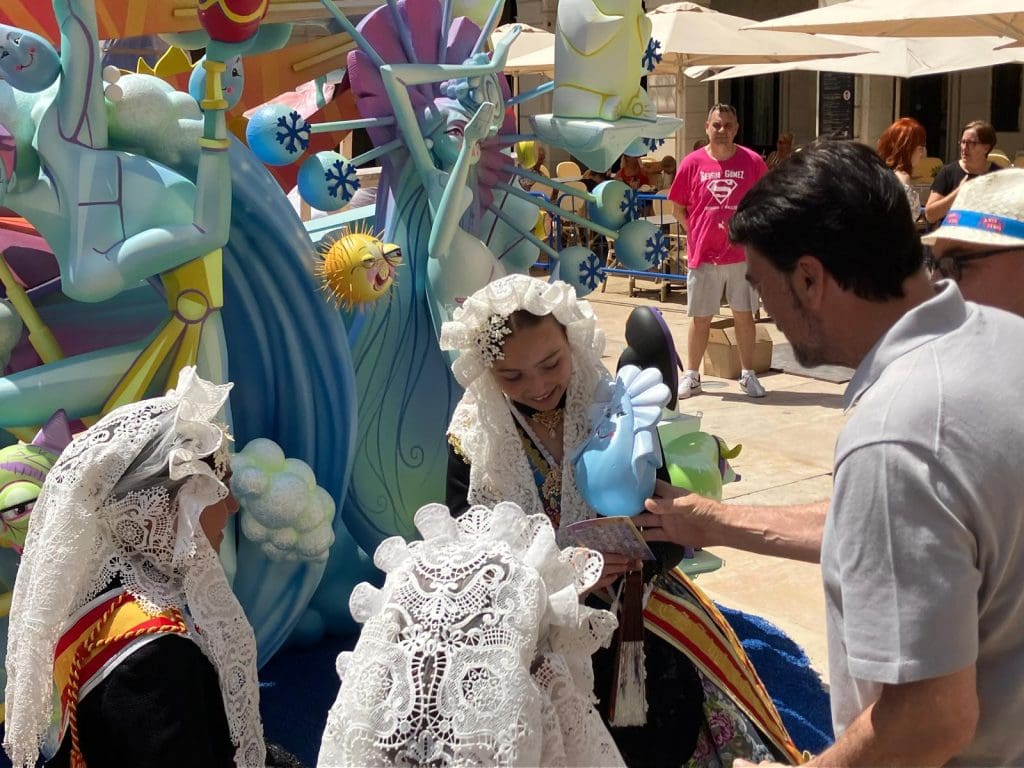 En su visita a la Hoguera adulta, Adriana Vico ha recibido un cartel de la ONCE con los nombres de los números alicantinos por parte de integrantes de la organización. Por su parte, el alcade, Luis Barcala, ha obsequiado a la Bellesa del Foc infantil Valentina Tárrega, con un ninot de una Bellesa elaborado por el creador del monumento, Sergio Gómez.