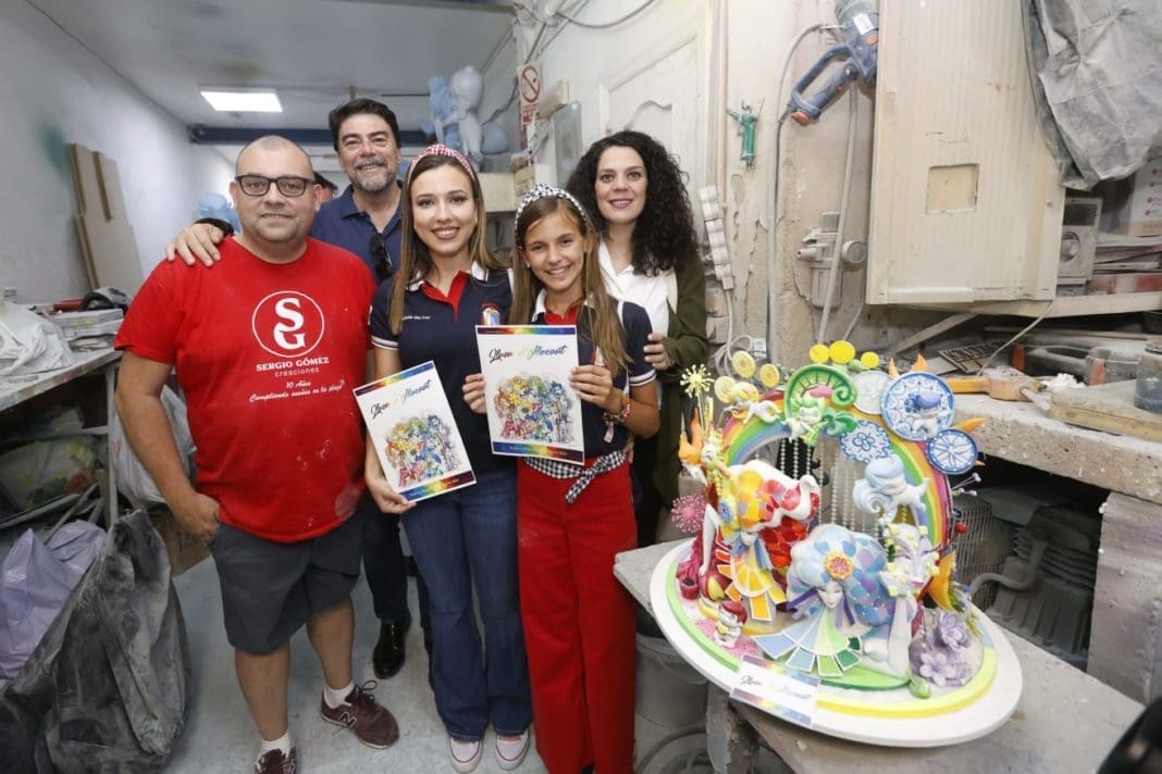 Más de cincuenta elementos, entre los que figuran ninots que oscilan entre los 10 centímetros y los 2,5 metros de altura, conforman la hoguera infantil ‘Llum d´Alacant’ que Sergio Gómez ultima en su taller del barrio de Santa Isabel. Ha explicado a Martina Lloret, y a sus Damas de Honor, durante la visita, que «la hoguera tendrá como uno de sus atractivos principales un arco iris que unirá los castillos de Santa Bárbara y San Fernando. Sobre él irá ensamblado un grupo de figuras».