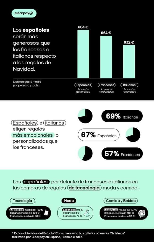 Aunque europeos y muy cercanos a nivel geográfico, españoles, franceses e italianos son también muy diferentes en algunos aspectos, como los hábitos de consumo. Así, por ejemplo, los españoles son los más generosos a la hora de comprar regalos de Navidad para sus seres queridos, tal y como revela el estudio “Consumers who buy gifts for others for Christmas”, realizado por la compañía líder en el segmento “Buy Now, Pay Later” Clearpay.