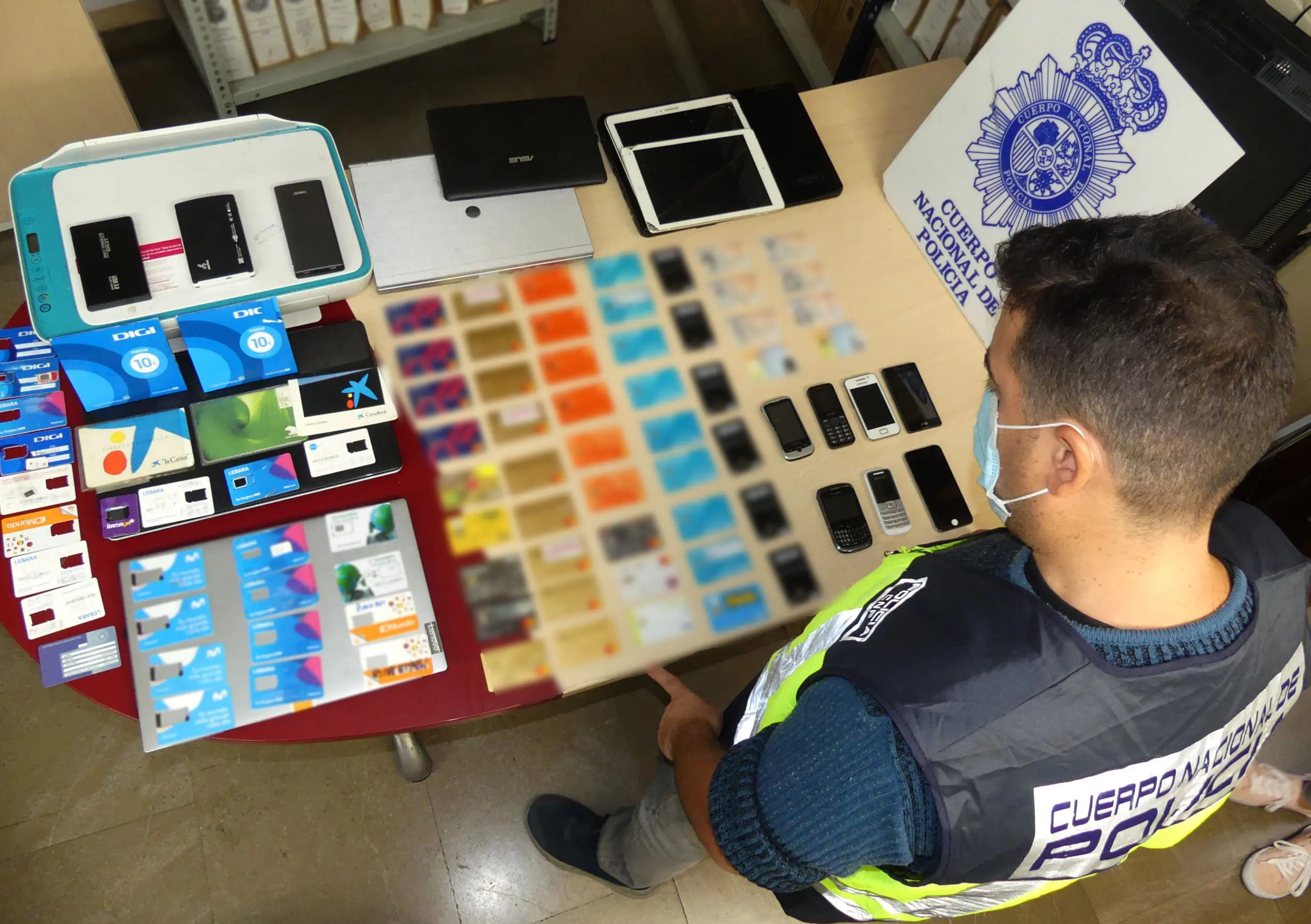 Tras su detención se practicaron dos registros domiciliarios en los que se intervinieron multitud de teléfonos móviles, tarjetas y cartillas bancarias, tarjetas sim, discos duros, ordenadores, facturas, DNIs auténticos y diversa documentación bancaria a nombre de terceras personas.