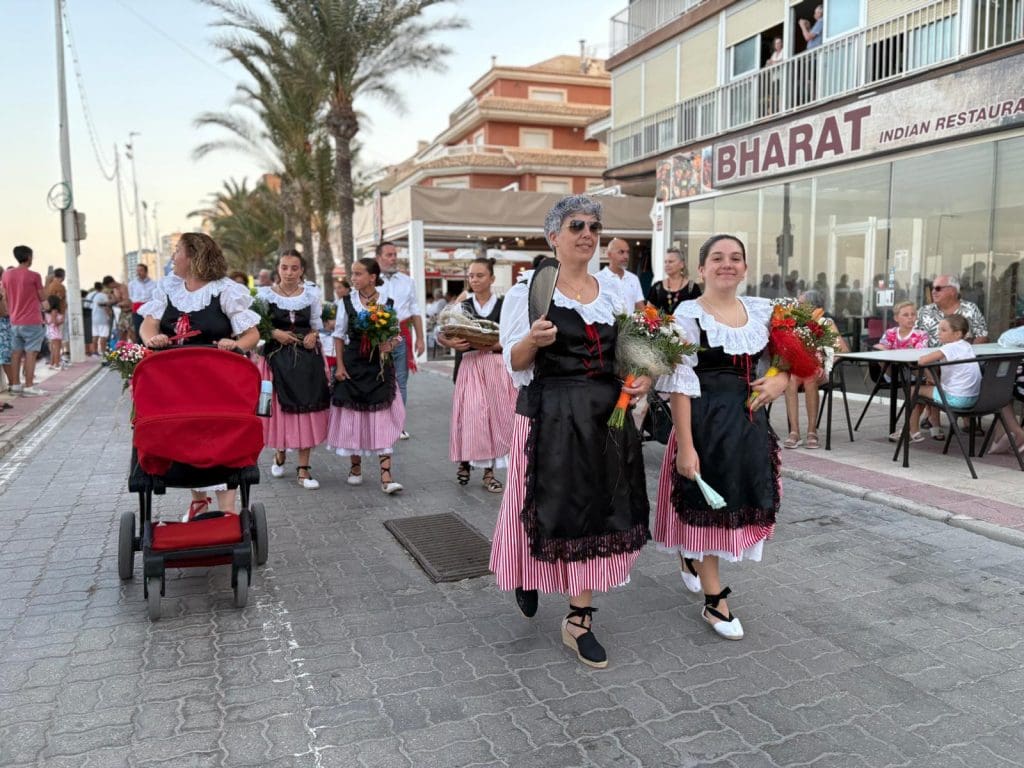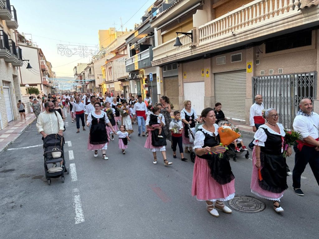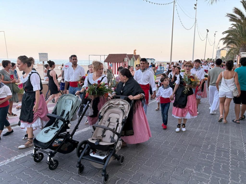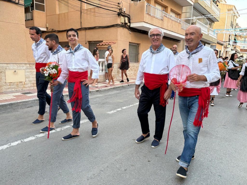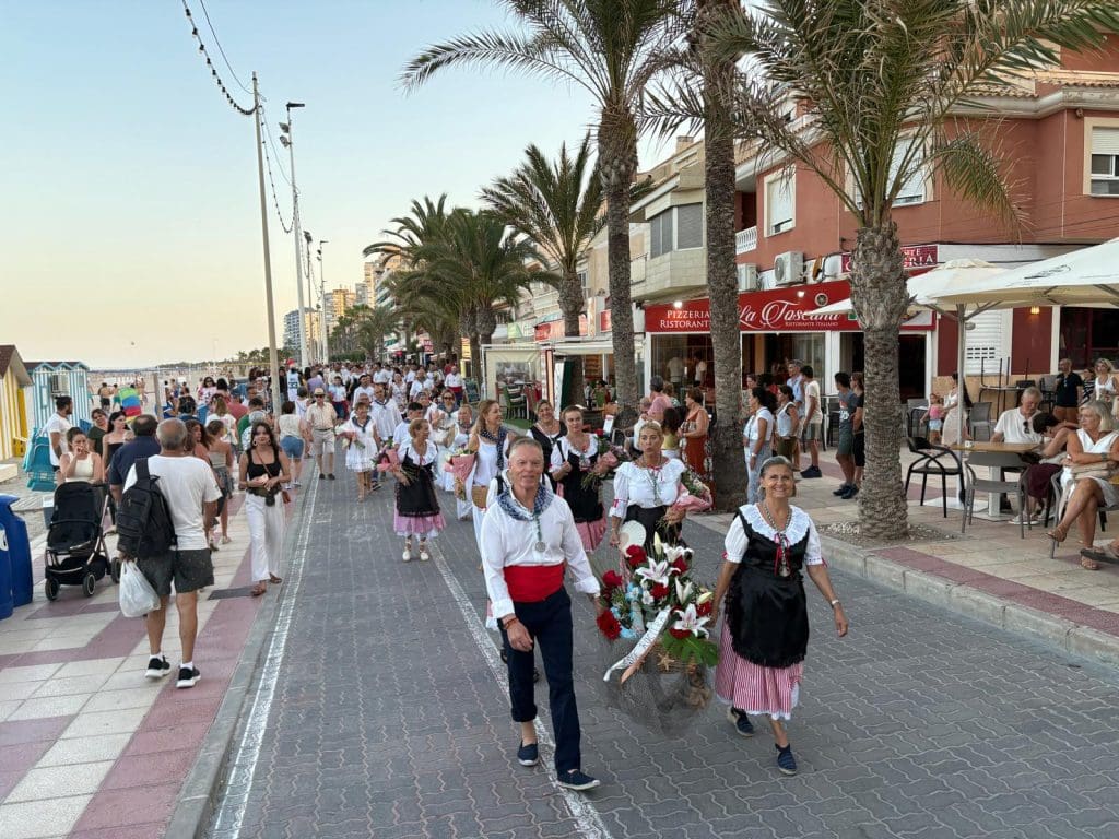 Así era la larga comitiva que ayer participó en la tradicional ofrenda floral a la Virgen del Carmen de El Campello, que hoy vive su día grande de las fiestas patronales, muy vinculadas al mar y sus gentes.