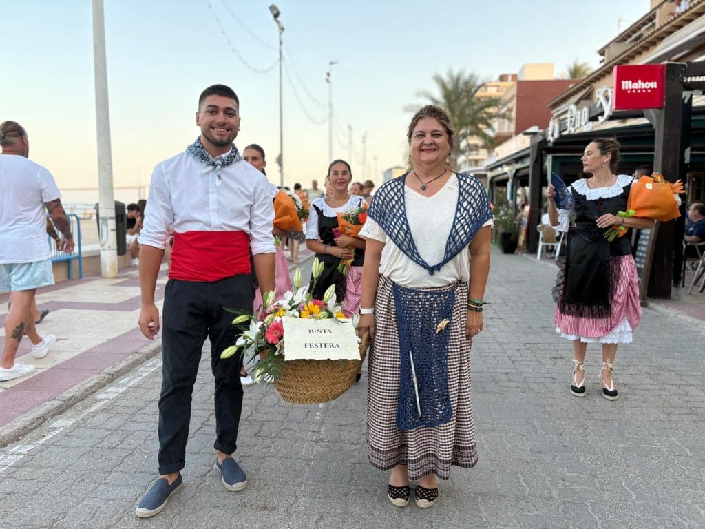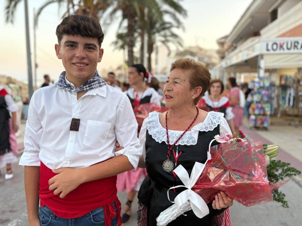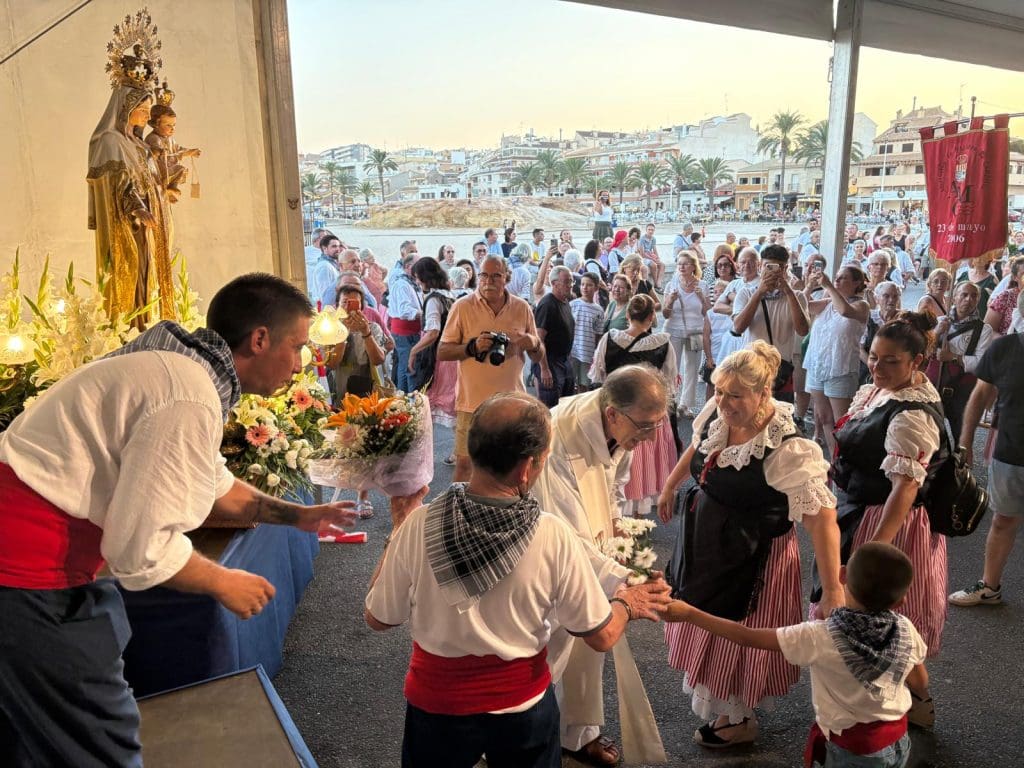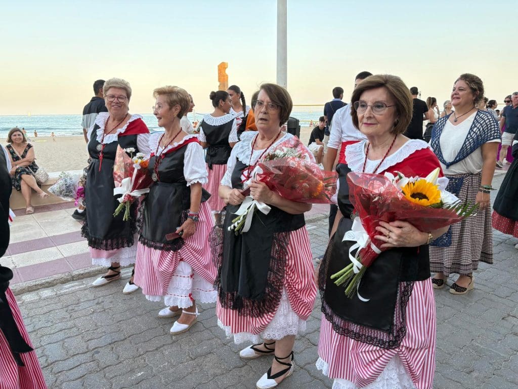 Hombres, mujeres, niños y mayores… Mucha gente en la ofrenda, que partió desde le Ermita de la Virgen del Carmen y recorrió la avenida del Carrer la Mar, el paseo marítimo, las calles Pizarro y Alcalde hasta llegar al puerto, donde se entregaban los ramos para completar el tablero dispuesto en la carpa que acoge la Virgen estos días, y donde la Coral Alborada de la Asociación de Mayores entonó, cómo no, la Salve Marinera.