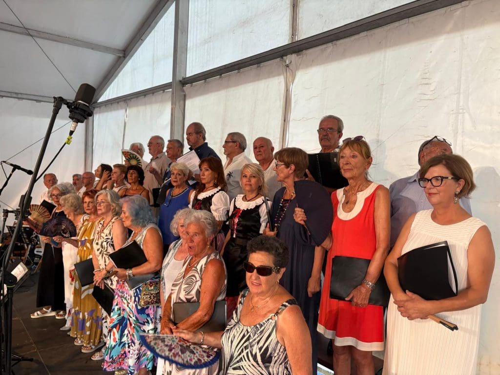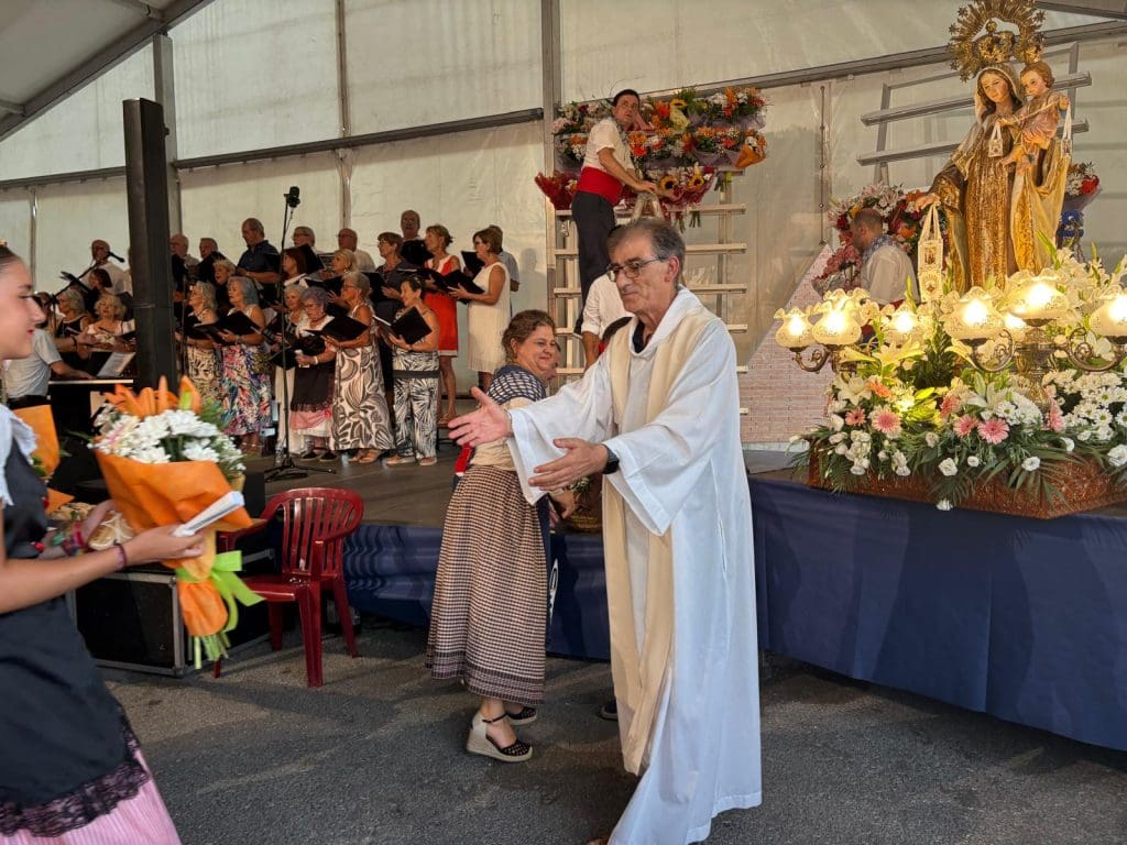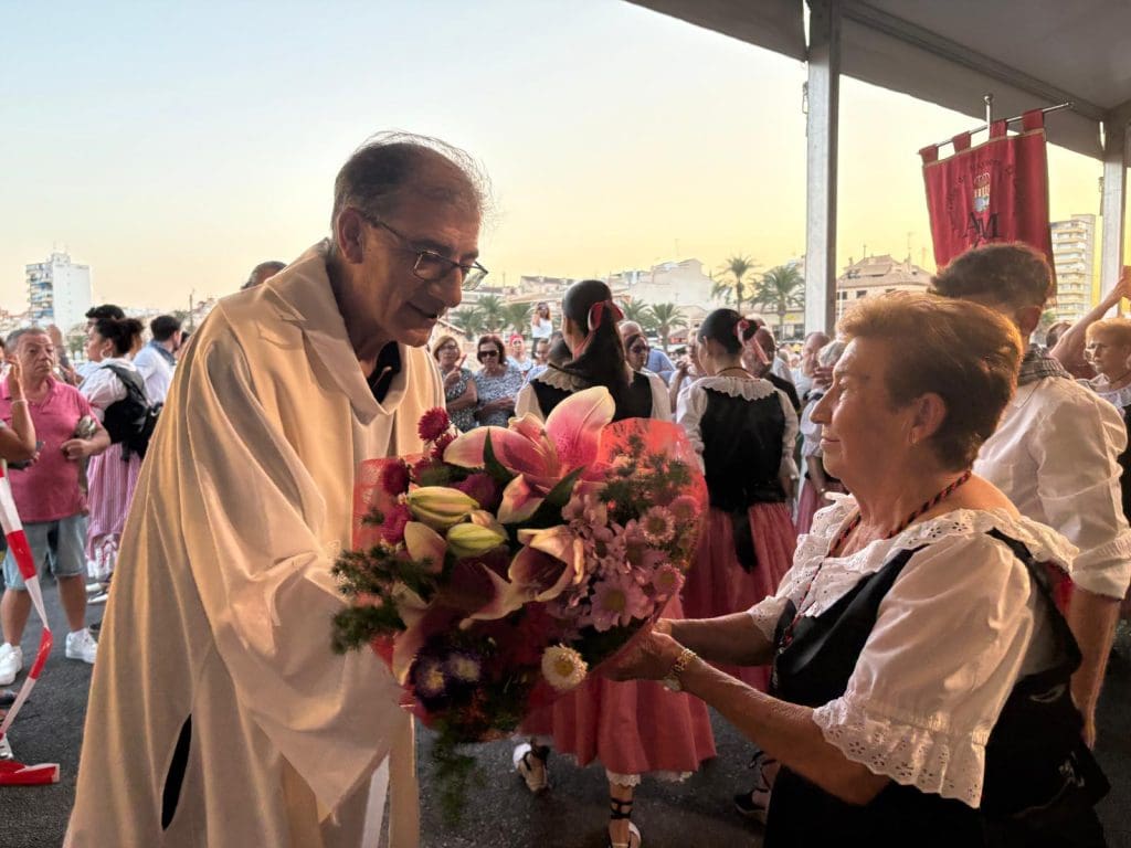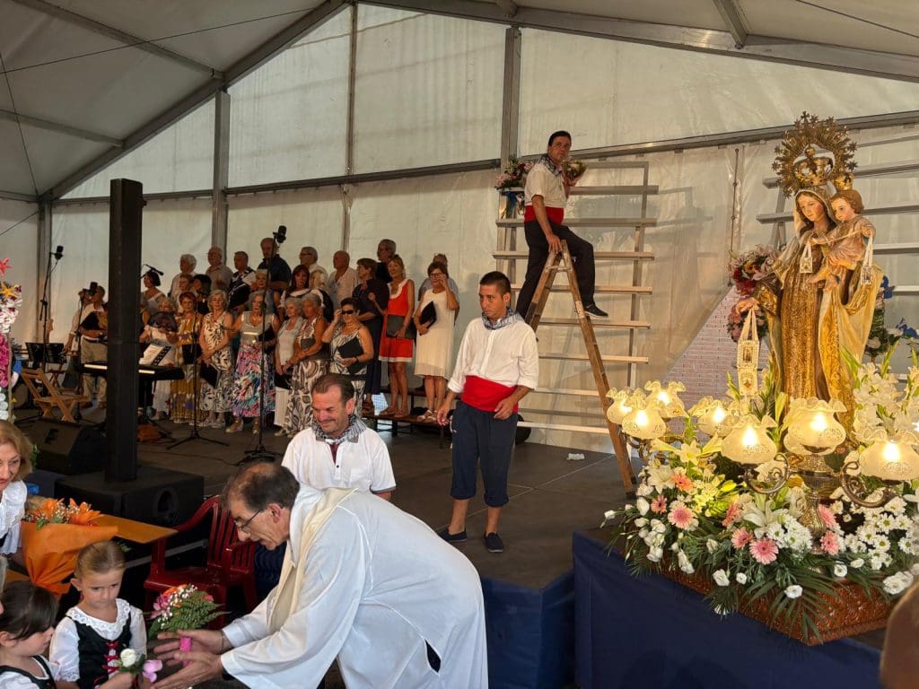 Hombres, mujeres, niños y mayores… Mucha gente en la ofrenda, que partió desde le Ermita de la Virgen del Carmen y recorrió la avenida del Carrer la Mar, el paseo marítimo, las calles Pizarro y Alcalde hasta llegar al puerto, donde se entregaban los ramos para completar el tablero dispuesto en la carpa que acoge la Virgen estos días, y donde la Coral Alborada de la Asociación de Mayores entonó, cómo no, la Salve Marinera.